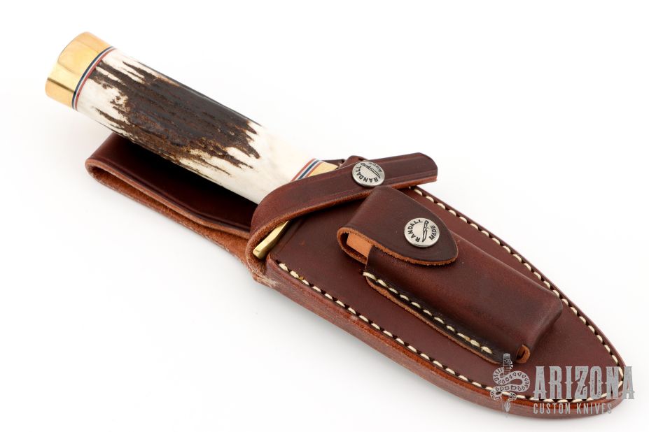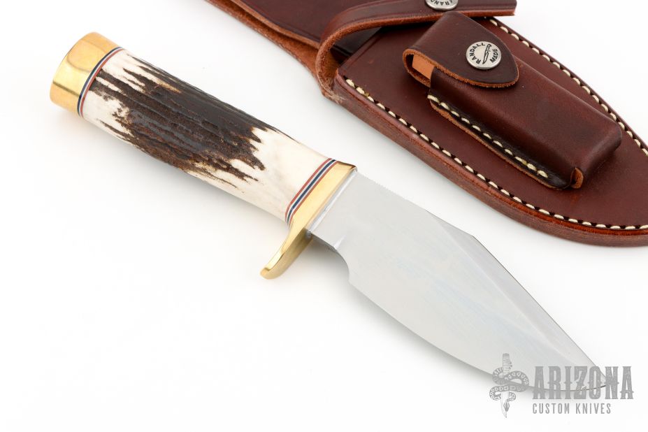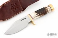 This knife has a satin finished blade with sharpened top edge and notched thumbrest, .206" blade stock and 1.729" depth, hidden tang construction. The handle has a brass guard and butt, stag grip, red/white/blue spacers. Comes with a brown leather sheath. New from maker.