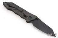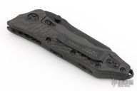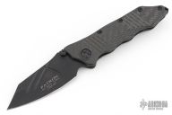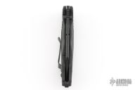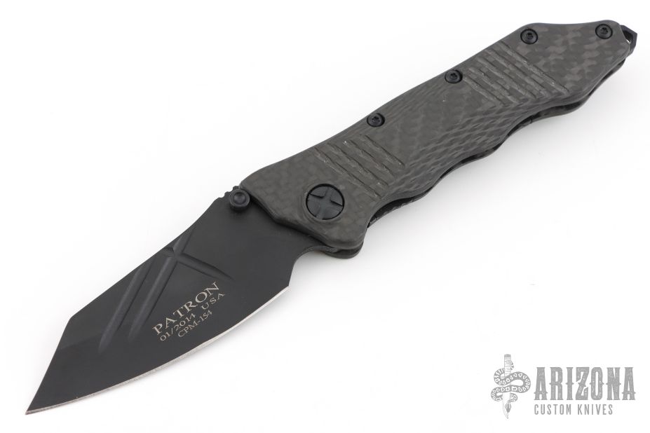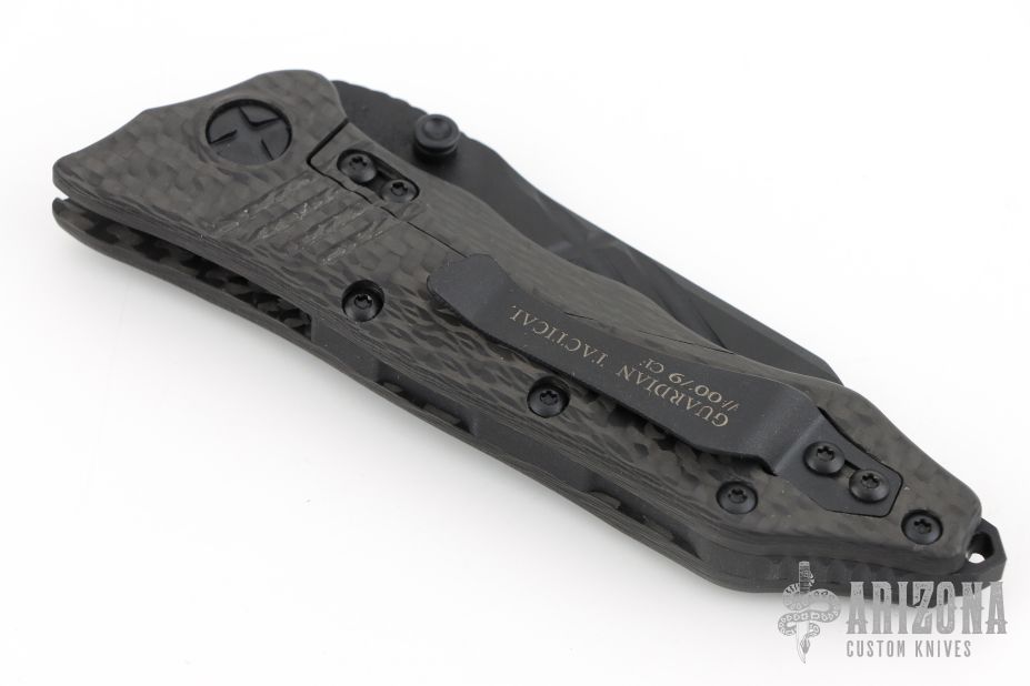 This Patron Folder by Guardian Tactical features a black coated clip point blade with swedge, dual thumb studs and notched thumb rest. The handle is comprised of a carbon fiber frame over a black coated steel backspacer with lanyard bail and steel inlaid lock bar. The black coated steel pocket clip is positioned for right hand, tip up carry. Includes original box, papers and draw string pouch. Excellent condition.