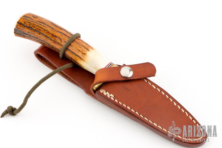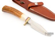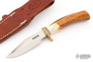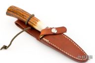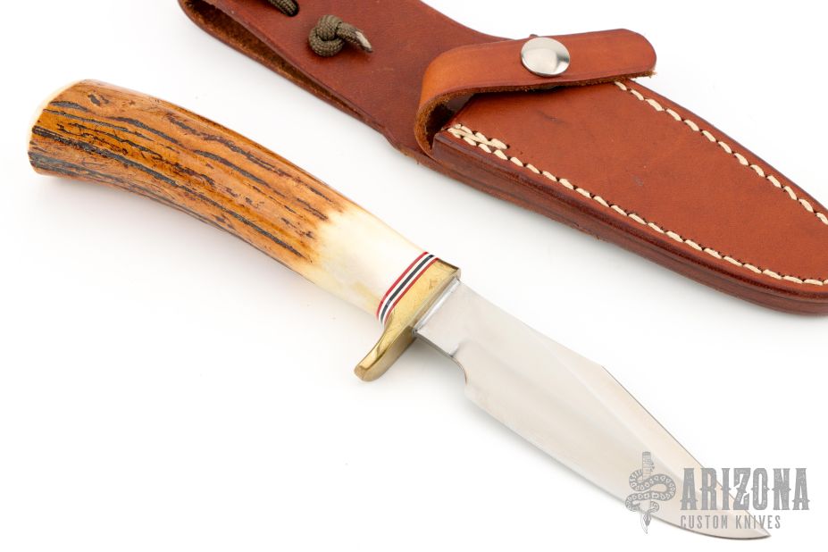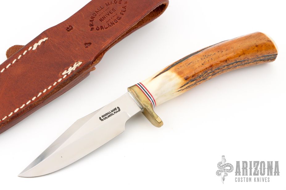 This Model 8-4 by Randall Made Knives features a satin finished blade with sharpened top edge, .148" blade thickness, 1.083" blade depth, hidden tang construction. Especially suitable for small fish and feathered game. Brass guard and stag grip with red/white/blue spacers. Comes with a brown leather sheath. Excellent condition.