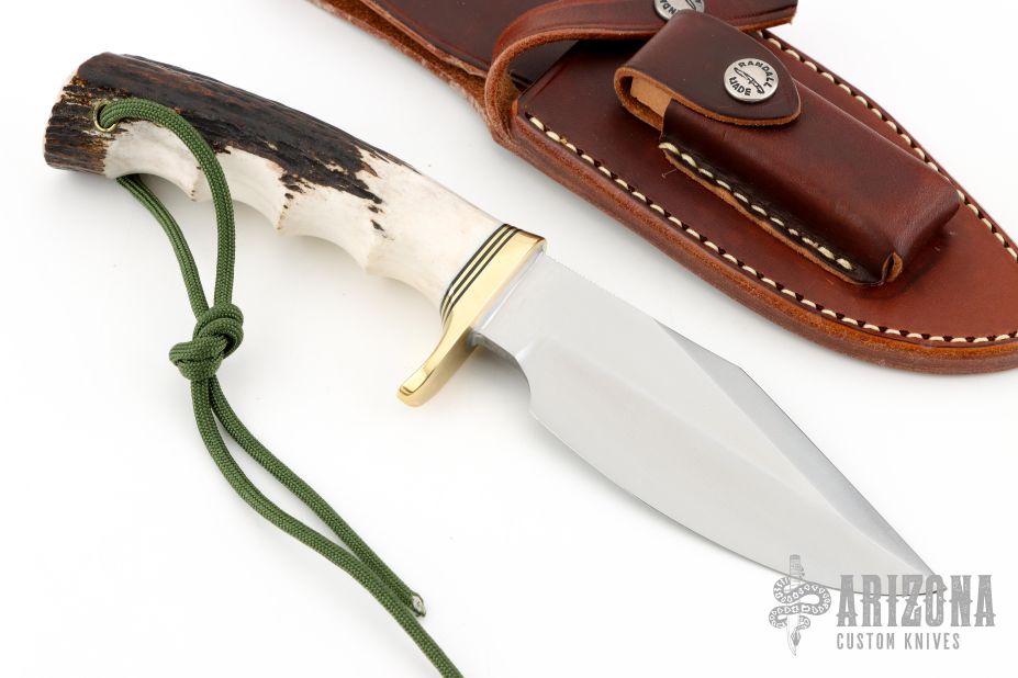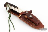 This knife has a satin finished blade with sharpened top edge and notched thumbrest, .201" blade stock and 1.675" depth, hidden tang construction. The handle has a brass guard, stag grip, black/brass spacers, lanyard hole at the butt. Comes with a brown leather sheath. New from maker.