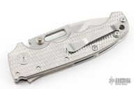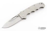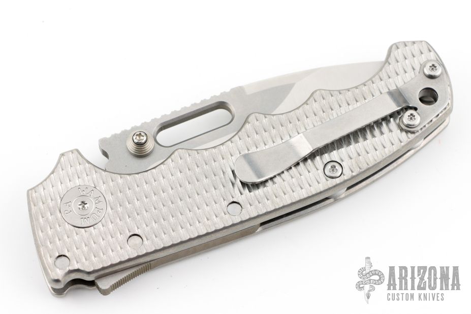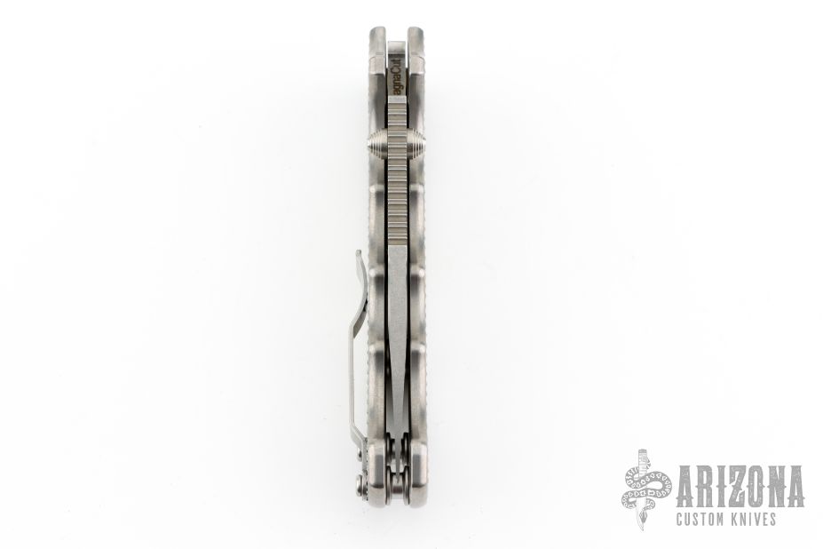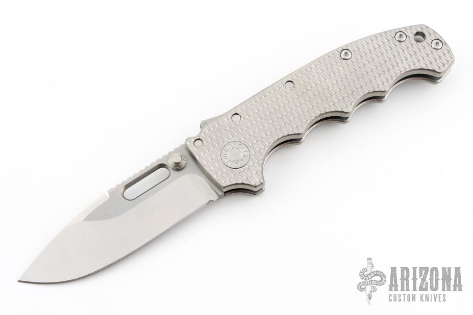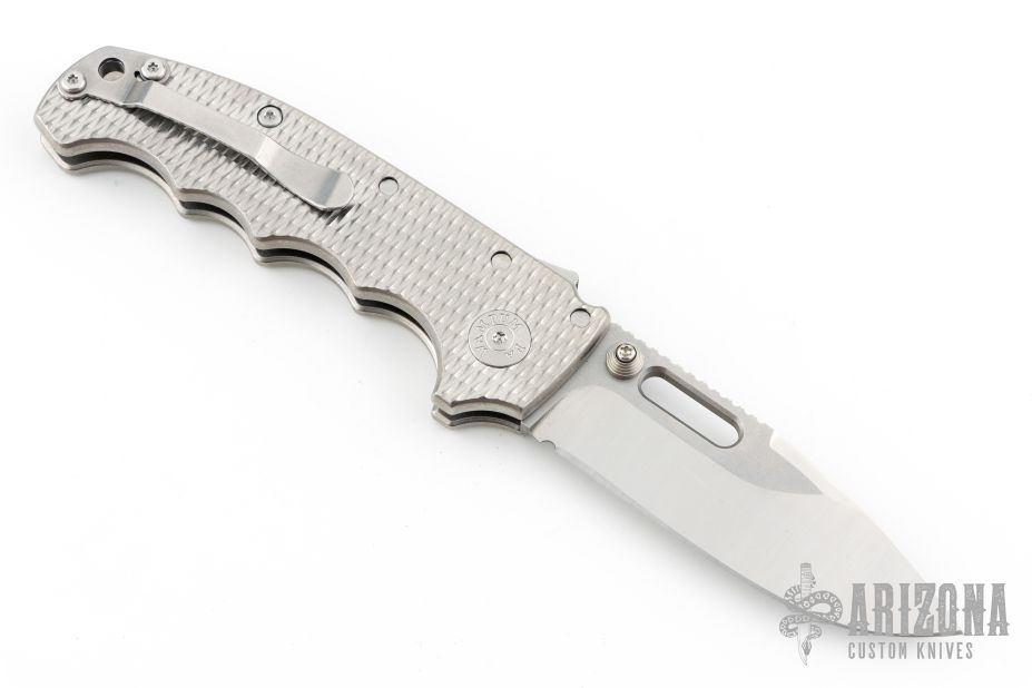 This AD20 by Andrew Demko features a satin finished blade with notched thumbrest, thumbhole and dual thumbstuds.  The handle has a textured/bead blast finished titanium frame with a tip up anodized titanium clip and "Shark" lock release on the spine. Comes with zippered case and original box. New from Bladeshow 2025!
