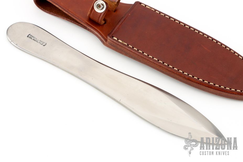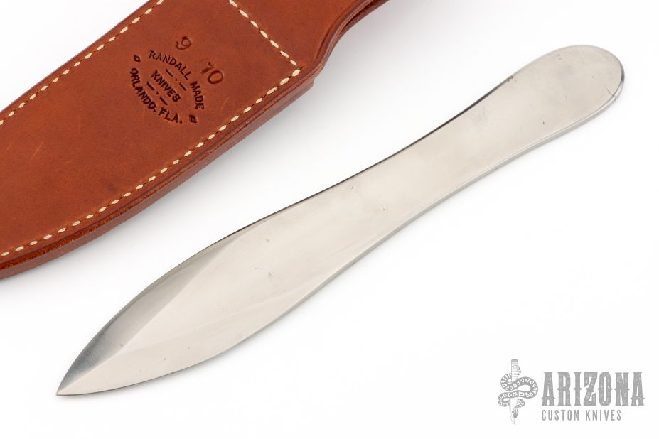 This Model 9 Pro-Thrower by Randall Made Knives. It features a satin finished blade and handle with .206" stock 1.526" blade depth. Solid one piece construction. Accurately balanced and scientifically designed for those desiring a practically indestructible throwing knife. Comes with original brown leather sheath. New from maker.
