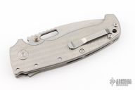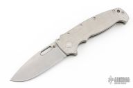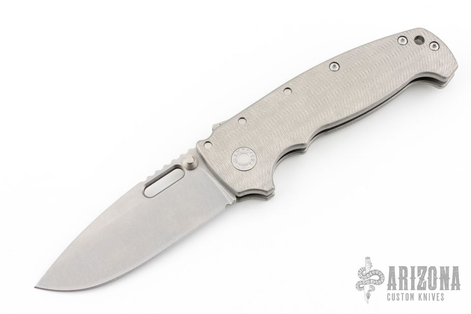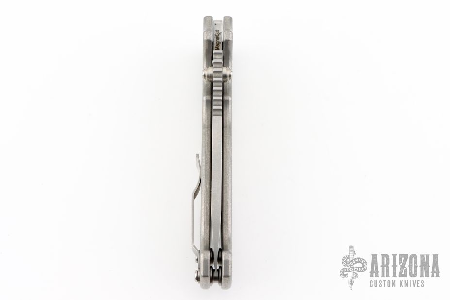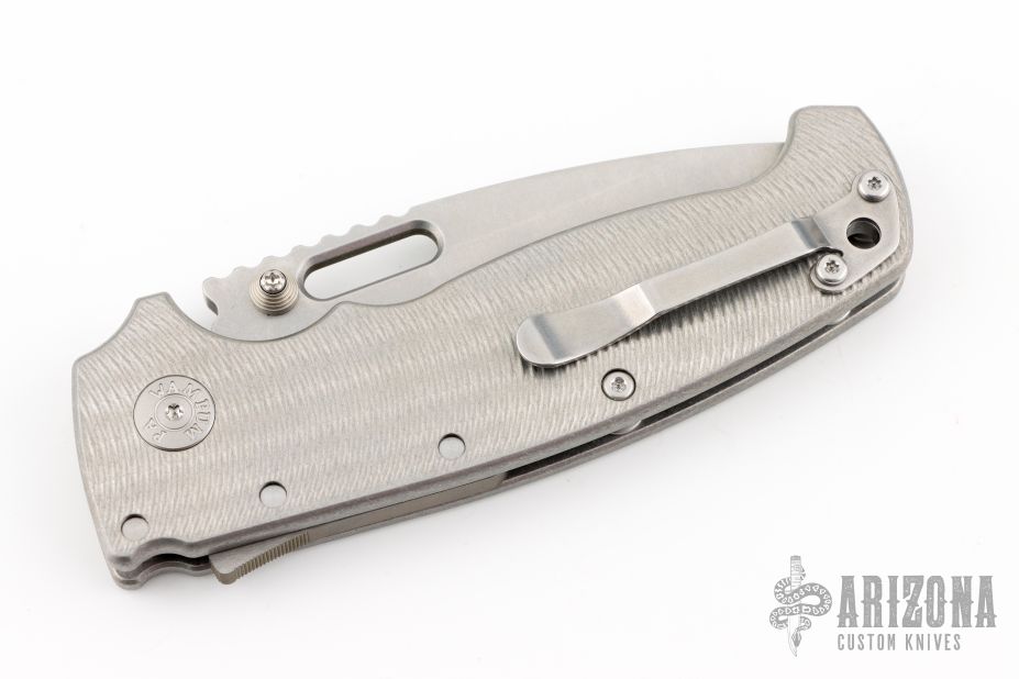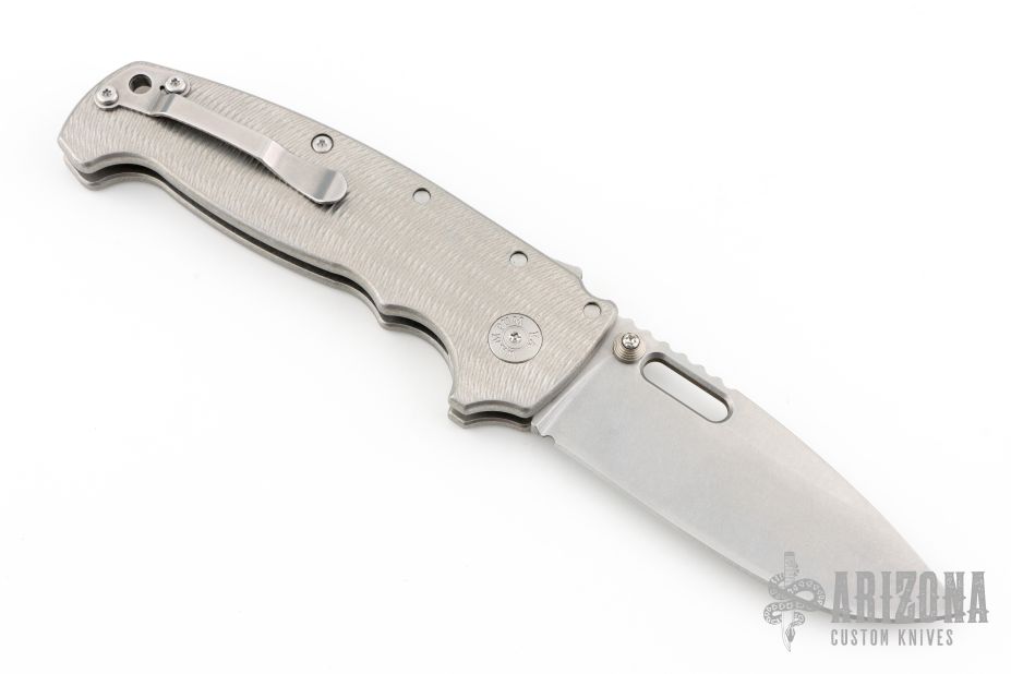 This AD20 by Andrew Demko features a tumble finished blade with notched thumbrest, thumbhole and dual thumbstuds.  The handle has a textured/bead blast finished titanium frame with a tip up titanium clip and "Shark" lock release on the spine. Comes with original box and zippered case. MagnaCut Blade. New from the 2025 Bladeshow!