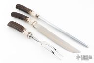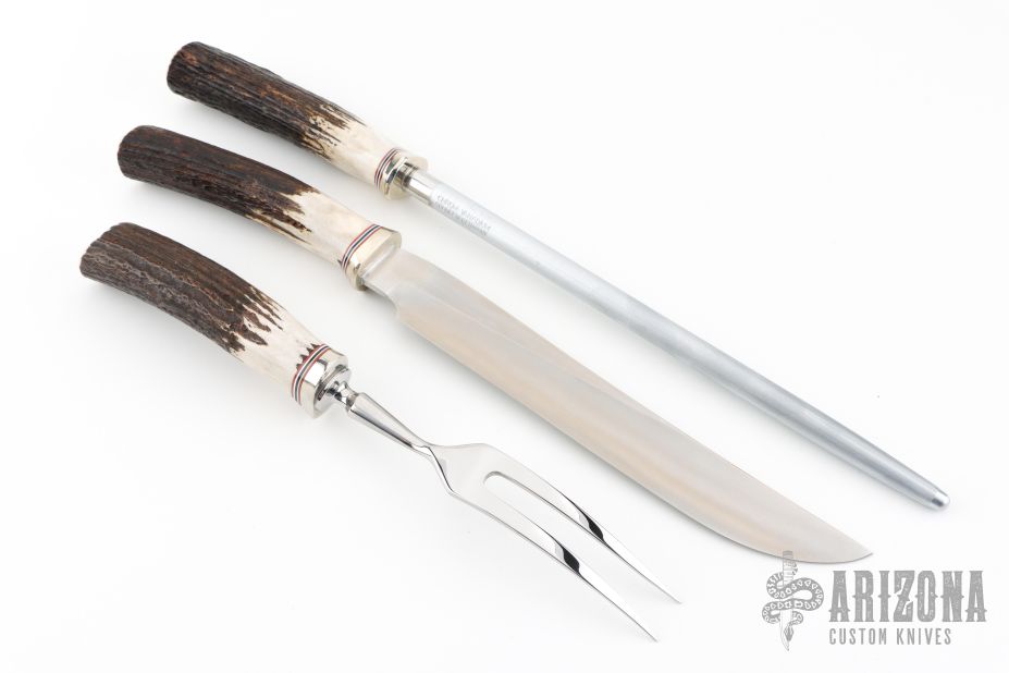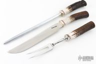 "Designed to meet every requirement as the ideal table knife, it is rustproof and will resist staining as ordinary blades do when used in carving meat. Complete with high-quality stag handled Sharpening Steel and Fork. A three-compartment felt case is included. " Satin finished blade with .175" blade stock and 1.179" blade depth, hidden tang construction. Nickel silver guards with stag grips and red/white/blue spacers. Comes with cloth rollup. New from maker!