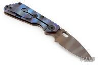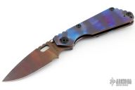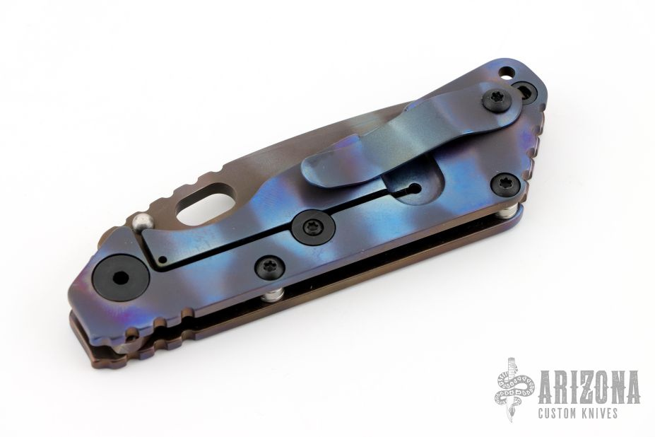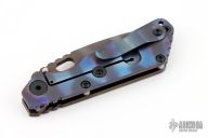 This SNG framelock folder by Mick Strider features a ghost stripe heat colored blade and a heat colored and stripe finished titanium frame and tip up titanium clip. Includes a "Lock Bar Stabilizer" for maximum reverse lock retention. Nice detent, lockup and blade seating. New condition.