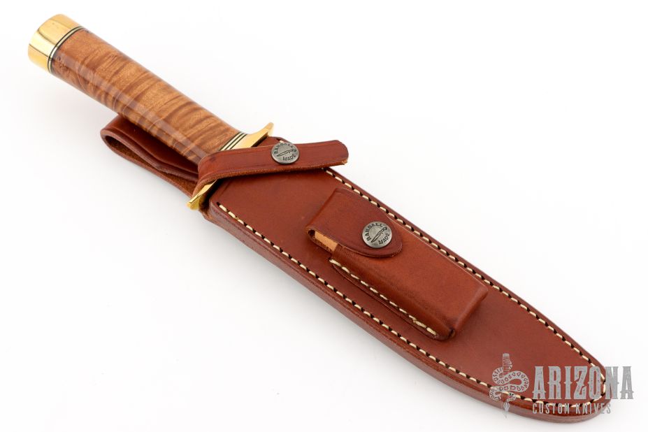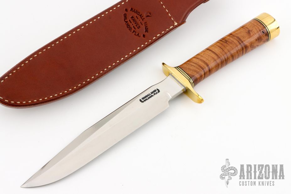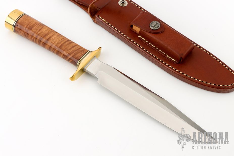 The Model 1 was made famous by Allied combat troops in World War II and has since been widely used in all theaters of war. It has a satin finished blade with sharpened top edge, .210" blade stock and 1.205" blade depth, hidden tang construction. The handle has a brass guard and butt, curly maple grip with black/brass spacers. Includes a brown leather sheath and a zippered case. Excellent condition.