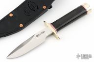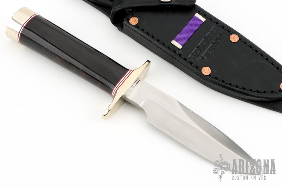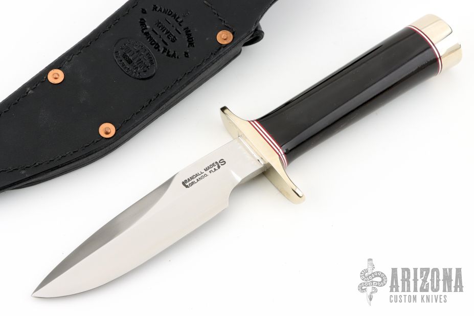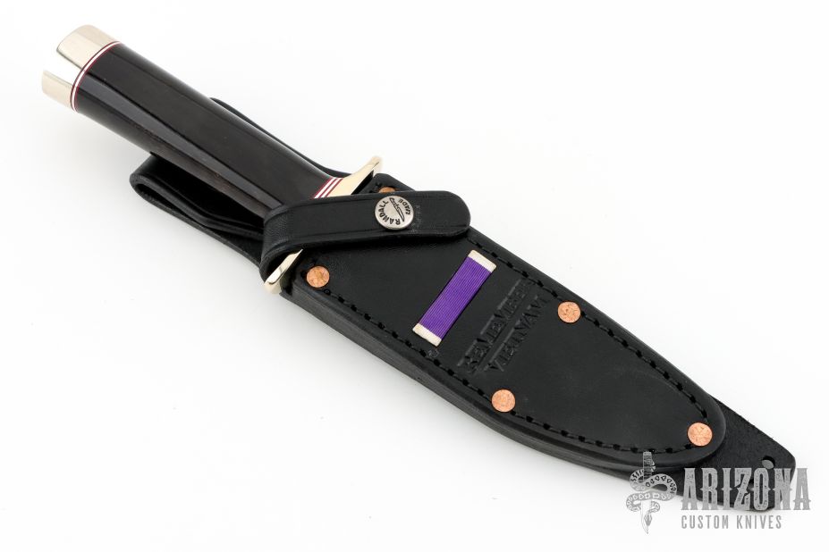 This Combat Companion by Randall Made Knives features a satin finished blade with sharpened top edge, .223" blade stock and 1.145" blade depth, hidden tang construction. The handle has a nickel silver guard and butt, buffalo horn grip with red/duralumin spacers. Comes with Sullivan's Custom black leather sheath with copper rivets and Vietnam Combat Ribbon and a Remember Vietnam zippered case. Excellent condition.