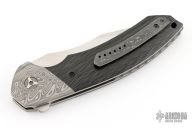 This Cornerstone by Peter Carey features a hand rub satin finished blade with swedge, notched thumb ramp and flipper. The handle is comprised of Damasteel bolsters and carbon waves scales over orange peel finished titanium liners and titanium dragon spine backspacer. Chad Nichols Damascus tip up clip. Great blade seating, detent and lock up. Includes padded and zippered case with makers card dated 10-2-24. Has a couple light scuffs and scratches, great condition otherwise.