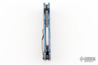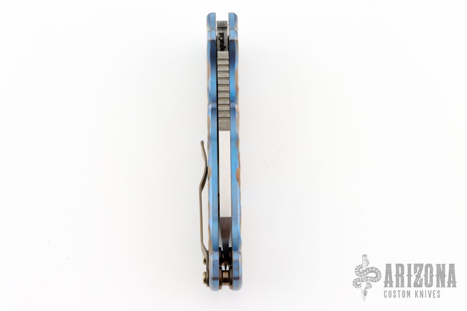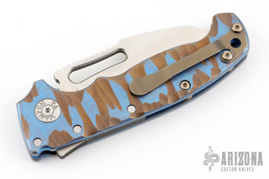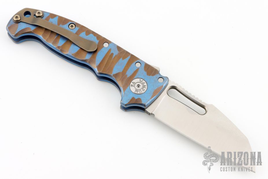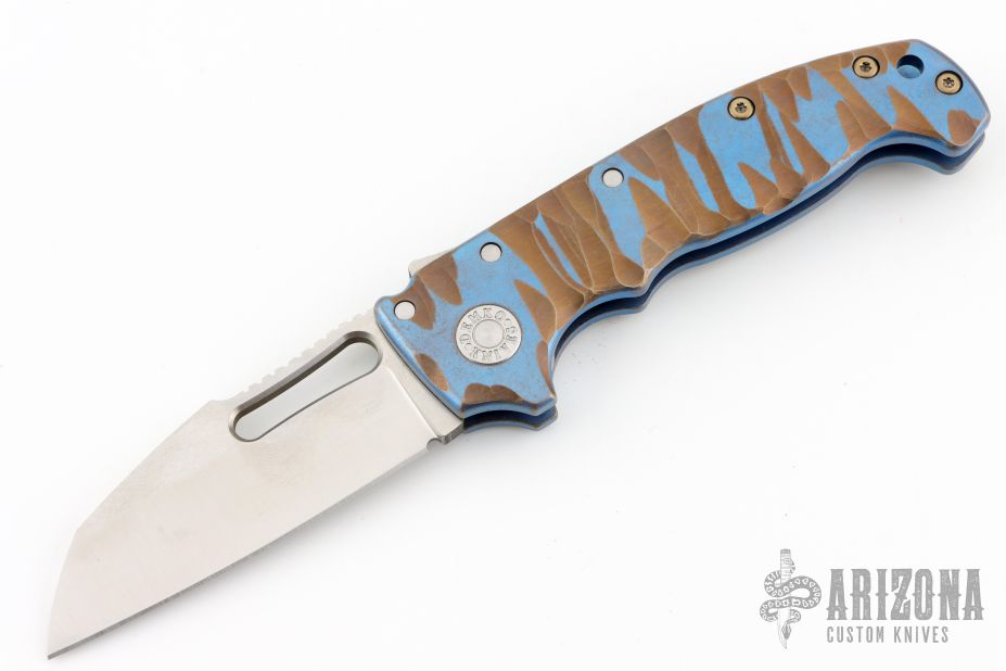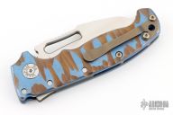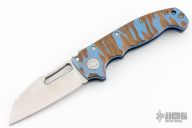 This AD20 by Andrew Demko features a hand ground hollow satin finished blade with notched thumbrest, thumbhole and dual thumbstuds.  The handle has an anodized titanium frame with a tip up anodized titanium clip and "Shark" lock release on the spine. Comes with original box and zippered case. MagnaCut Blade. Excellent condition.