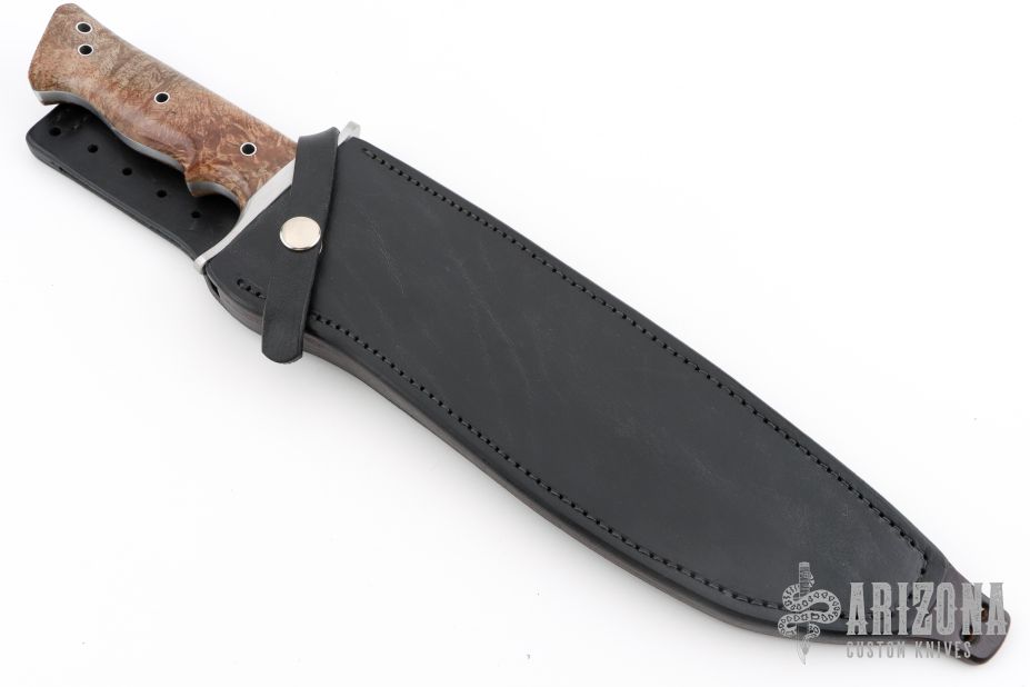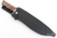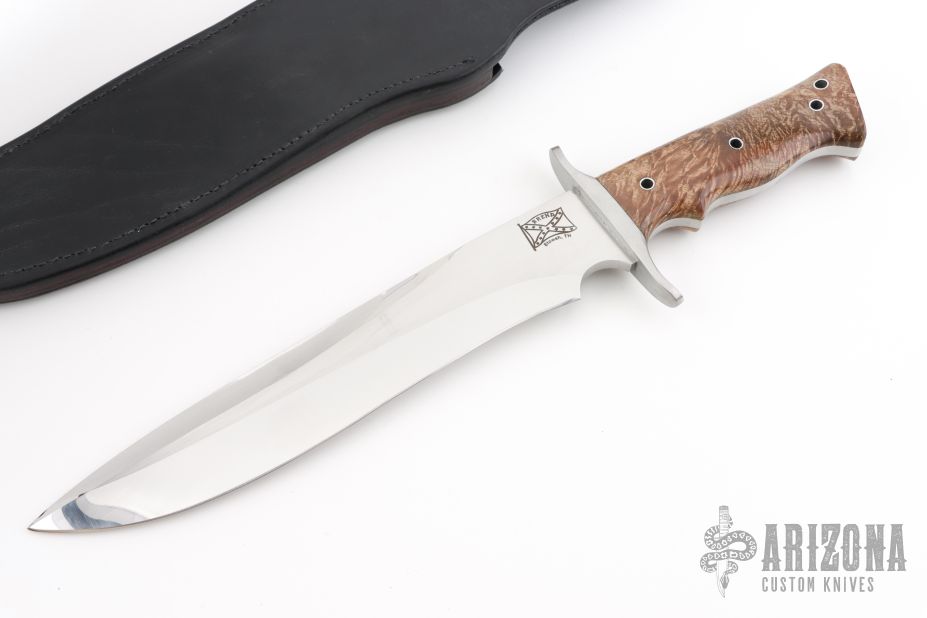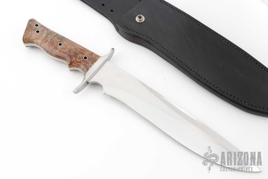 This Model 2-10 by Walter Brend features a double hollow ground blade with hand rub satin finished flats and satin polished grinds, and a sharpened top edge, .253" blade stock and 1.831" blade depth, full tang construction. The handle has a satin finished stainless steel double guard, and curly maple scales, hollow tube pins and lanyard hole. Comes with a black leather sheath by Chattanooga Leatherworks. New from maker at the 2025 Blade Show.