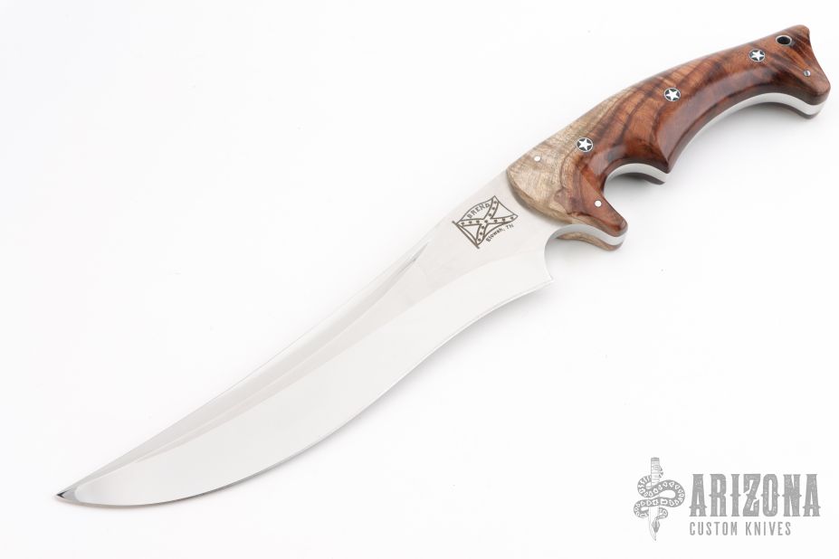 Walter Brend is a living legend in the knife industry. He's been grinding knives for over forty years and has gained a reputation for having some of the most intricate and most beautiful custom grind lines around. He specializes in tactical folders and fixed blades that are just the right combination of size, style, and of course functionality. After living in several states, Walter and his wife moved to a rural McMinn County Tennessee home and soon began turning out new styles for collectors in an expanded work shop. The shop is filled with different sized belt grinders and unique equipment needed to cut and finish his one-of-a kind creations. Several machines were designed by him and built by a specialty company. Along with constantly developing new and unique knife design styles, Walter also takes special orders from collectors who have their own ideas. Buyers in other countries often seek special creations, asking for both hunting and collectible knives. Walter said his most expensive weapon created was a sword that sold for $30,000 to a collector in China.