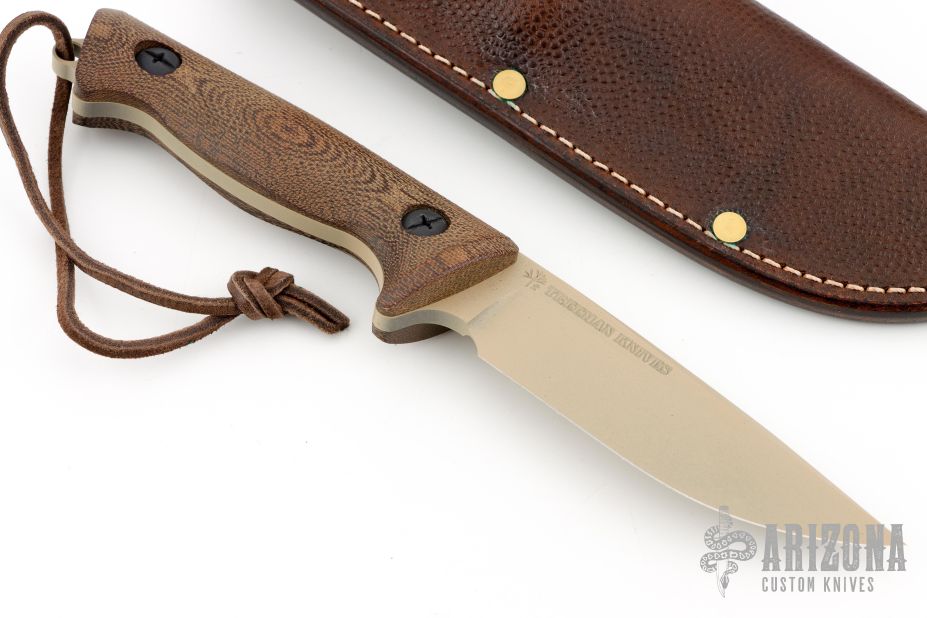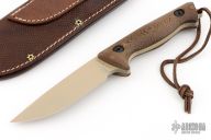 This Recon Hunter by Treeman Knives has a tan drop point blade with a false top edge and notched thumbrest. The blade is 57/58 Rc and vacuum heat treated in a state-of-the-art furnace, .191" blade stock and 1.228" blade depth, full tang construction. It will out cut and hold an edge as good as or better than any knife made. The scales are brown canvas micarta. Comes with a very nice Mosher leather belt sheath and zipper case. Excellent condition.