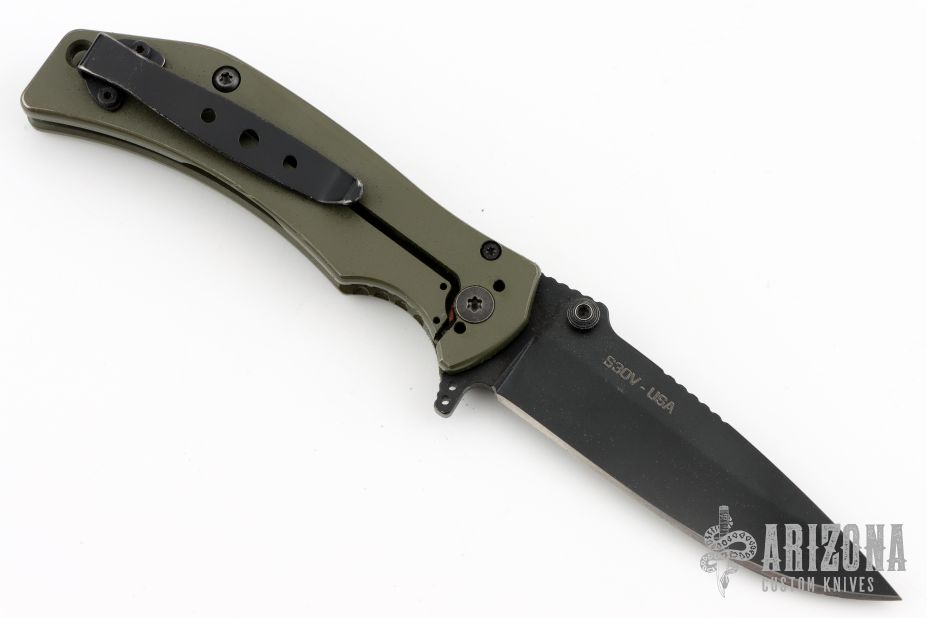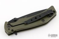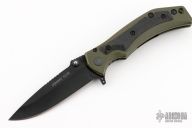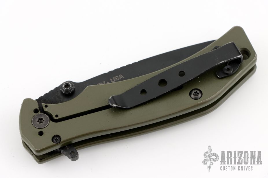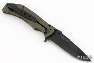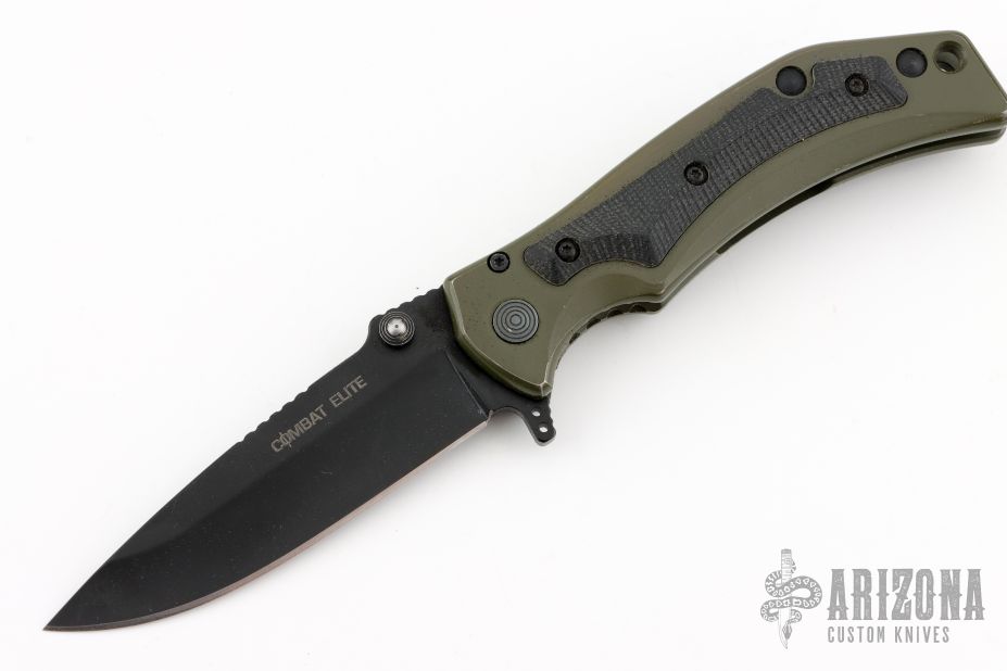 Combat Elite, Inc. was formed by Darrel Ralph and Ryan Wilson. The RRF (Rapid Response Folder)features a green Armor-Tuff titanium frame with a MAXX GRIP 3D machined G10 inlay,integral frame lock, notched thumbrest, contoured handle and all black hardware. Comes in Maker's zipper case. The spring is missing - it is a manual flipper and/or requires a new spring. Has some wear on the handle, otherwise good condition.