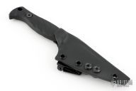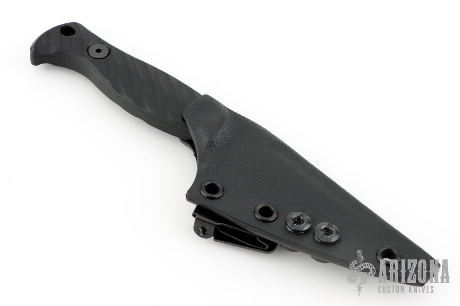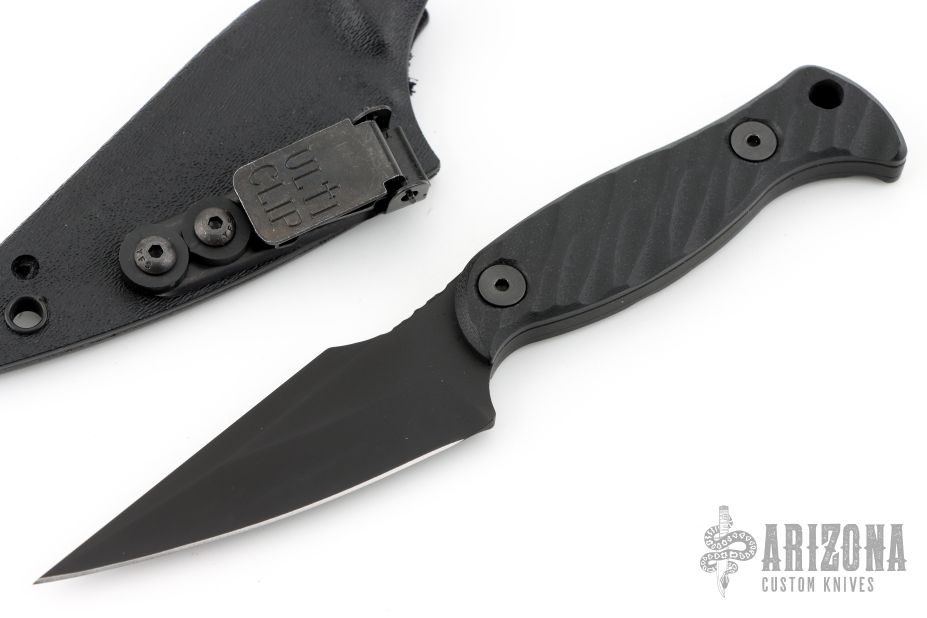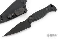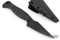 This Gulo Gulo by Half Face Blades features a black blade with false top edge, .142" blade stock and 1.123" blade depth, full tang construction.  The handle has sculpted black G10 scales. Comes with a kydex sheath with belt clip, warrantee card, and original box.  Has a couple light scuffs, otherwise Excellent Condition.