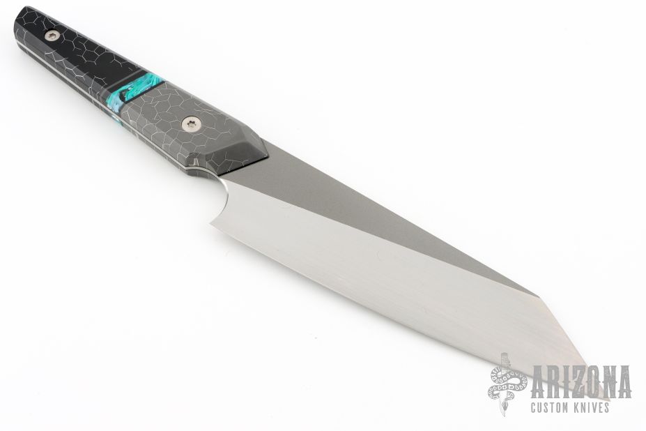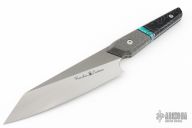 This Gyuto by Kanaloa Custom Knives features a two-tone finished blade with bead blast flats, and hand rub satin finished bevels. The knife has .102" blade stock and 2.075" blade depth, full tang construction. The handle has a nice mosaic of composite materials, and stainless fasteners. Comes with a zippered case. New from maker at the 2025 Blade Show.
