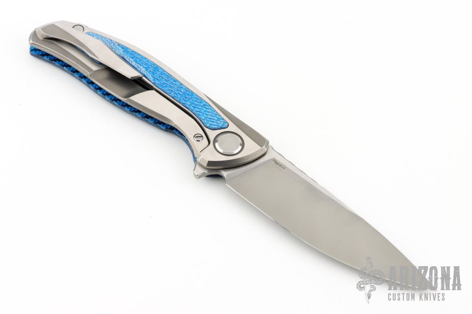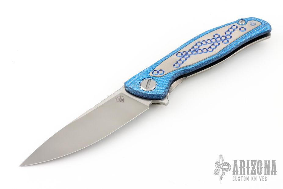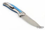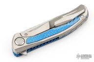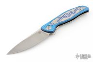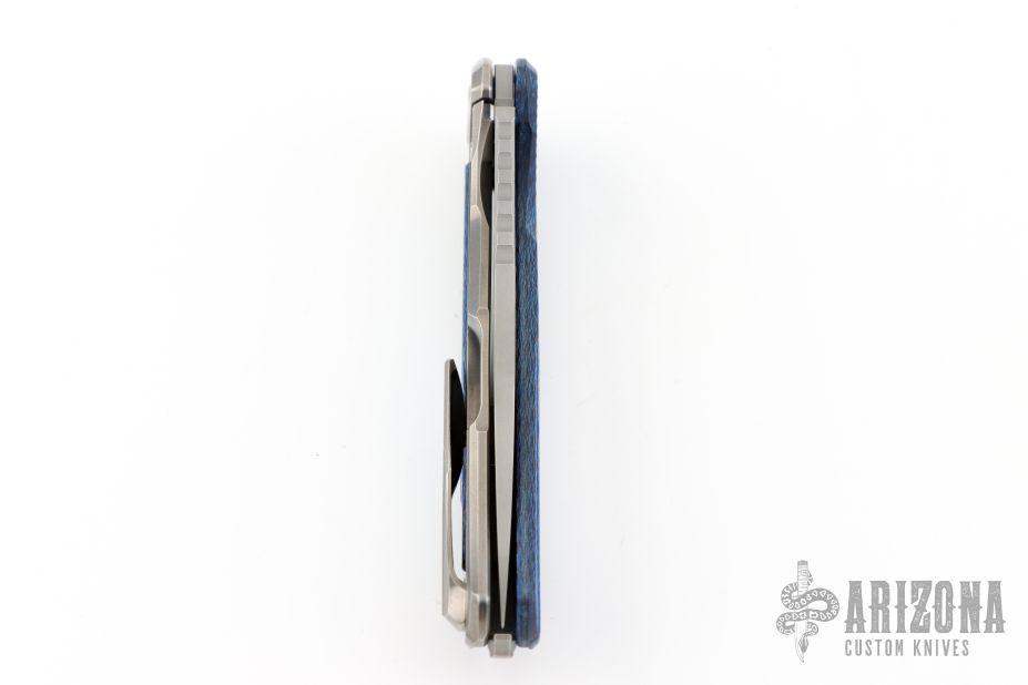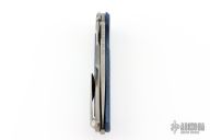 This Hati CGG is a collaboration between Chris Reeve Knives and Shirogorov Knives, notched thumbrest and flipper. The handle has an blue Alutex front scale with a titanium inlay with unique graphic, two-tone titanium lockside with blue Alutex inlay, matching tip up clip and backspacer with lanyard hole, stainless lockface insert. Rides on Roller Bearing System, nice detent, lockup and blade seating. Comes with original box and COA dated 2025. New condition.