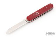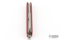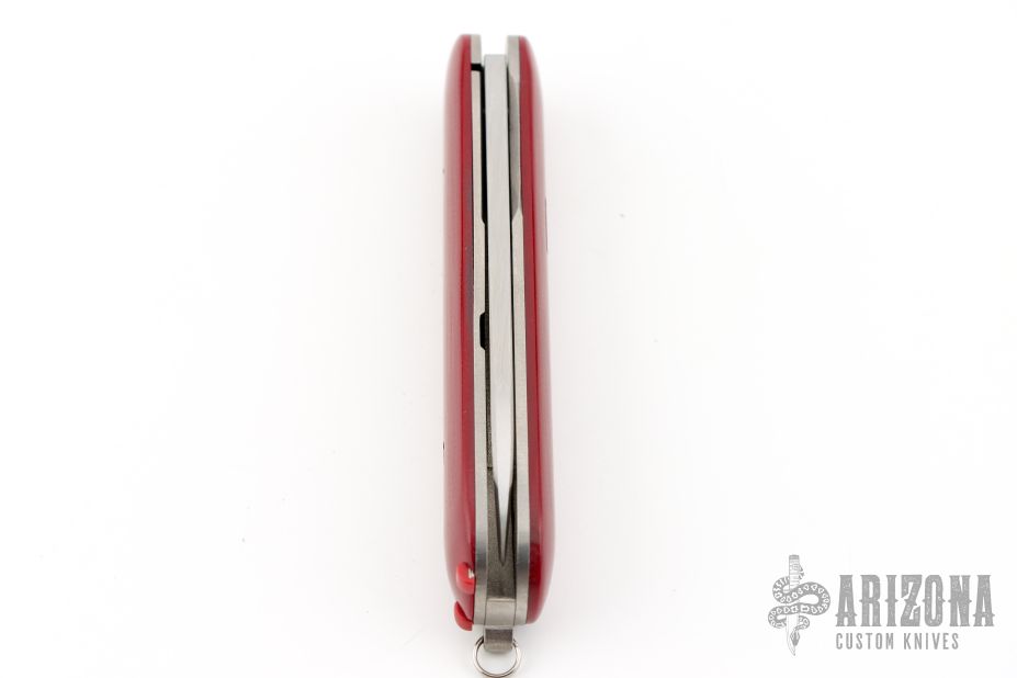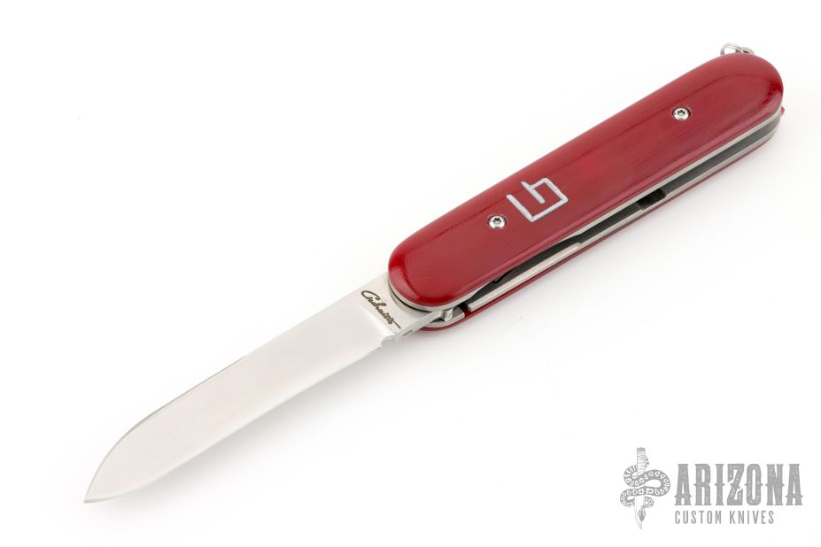 This Switch Army Switchblade by Chuck Gedraitis features a satin finished blade. The handle has red G-10 scales, orange peel finish titanium liners, backspacer with lanyard hole. Has tweezers and toothpick like a Swiss Army Knife. Nice action, lockup and blade seating. Comes with zipper case and COA dated 2025. New from maker at the 2025 Blade Show.