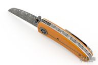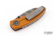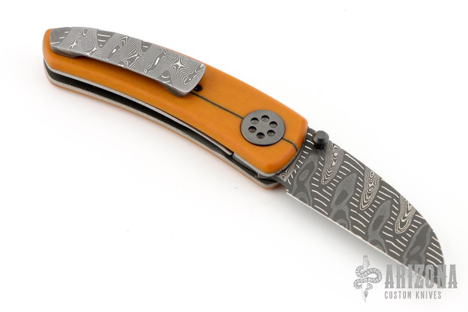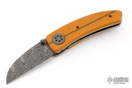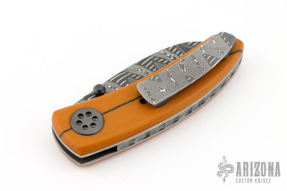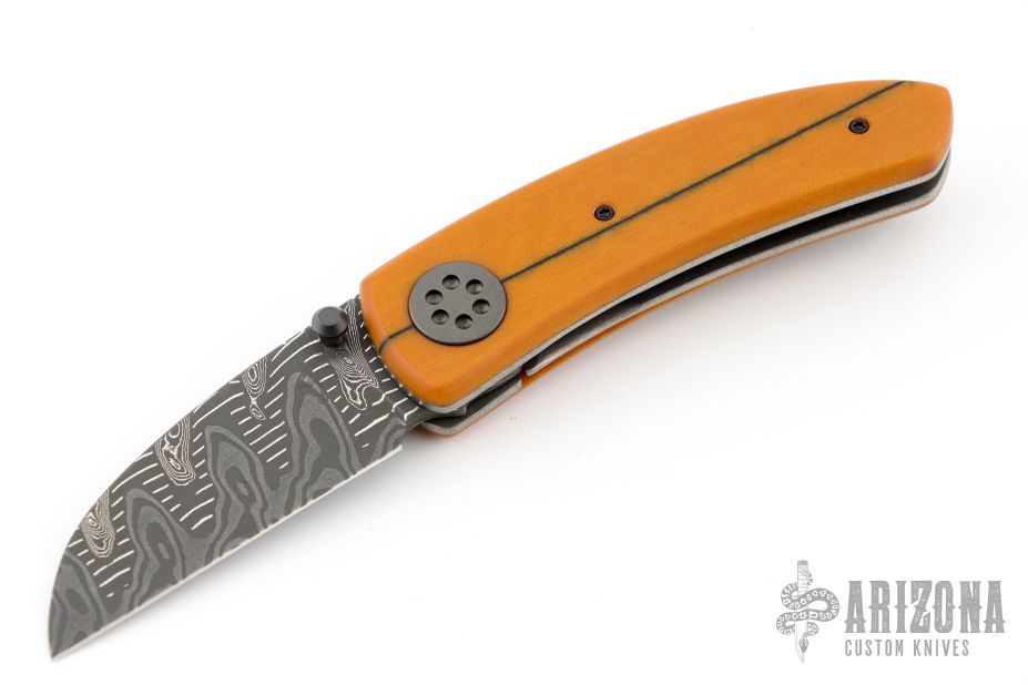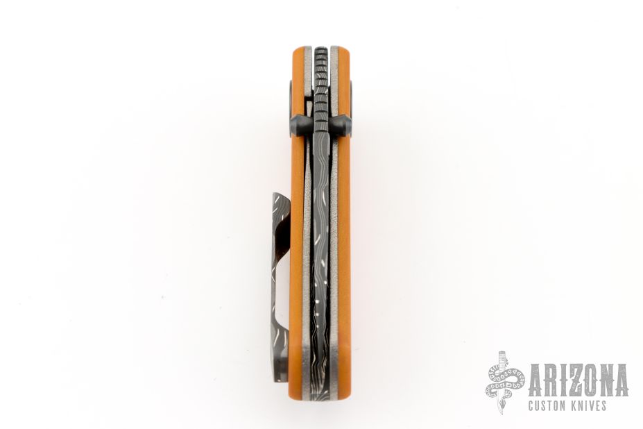 This Compact Model 7 Sans Hawkbill Grind AKA the T.O. configuration by Rainy Day Knives features a Mike Norris "Hybrid" Stainless Damascus blade with notched thumbrest and dual zirconium thumbstuds. The handle has vintage linen micarta scales, orange peel finished titanium liners, zirconium pivot, notched Damascus backspacer, tip up Damascus clip with hidden screws. Nice detent, lockup and blade seating. Comes with zippered case and COA. New from maker at the 2025 Blade Show.