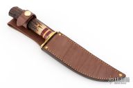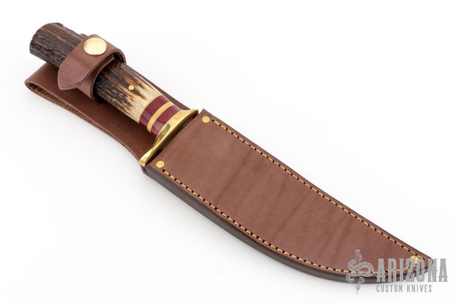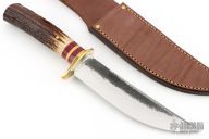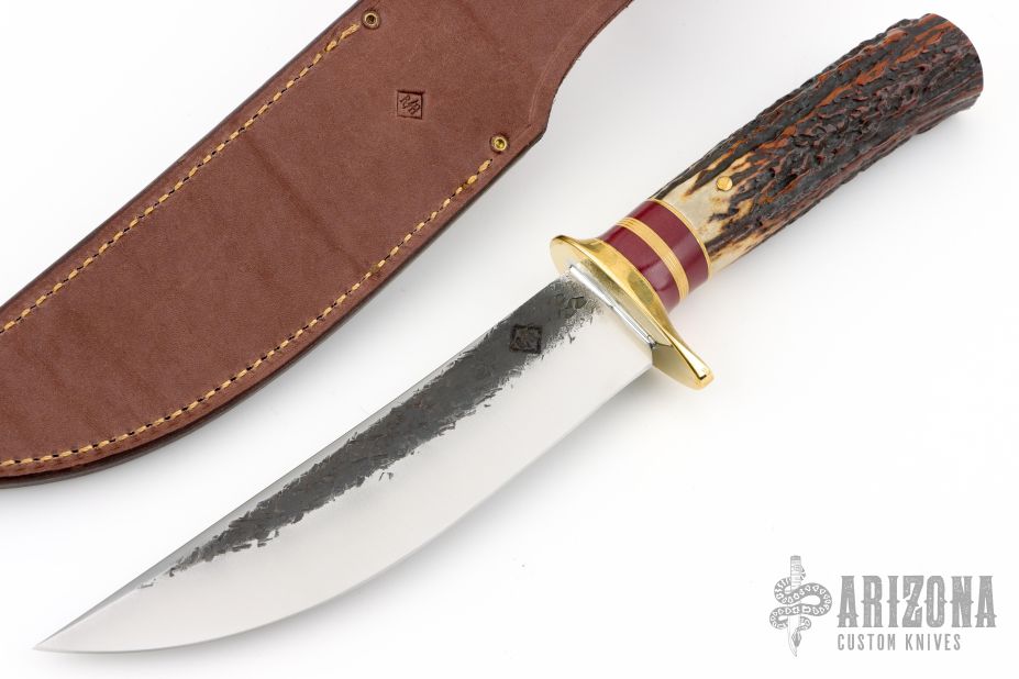 This knife by Rocco Handmade features a two-tone, hollow ground blade with hammer marked flats, satin finished bevels, a false top edge, .180" blade thickness and 1.339" blade depth, hidden tang construction. The handle has a brass guard, pinned sambar stag grip, red/brass/yellow spacer pattern. Great look and feel. Comes with Treeman brown leather sheath. New from maker at the 2025 Blade show!