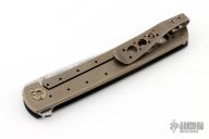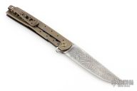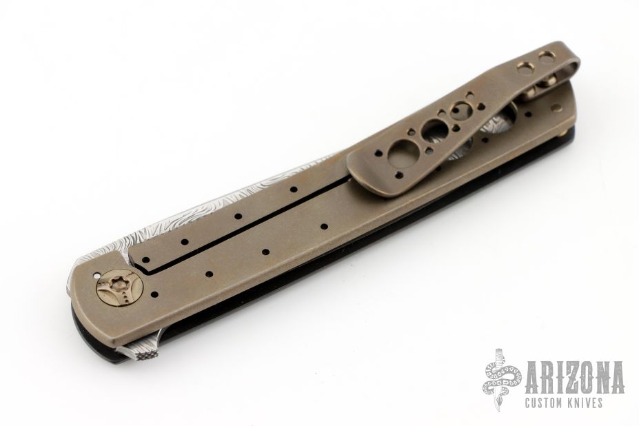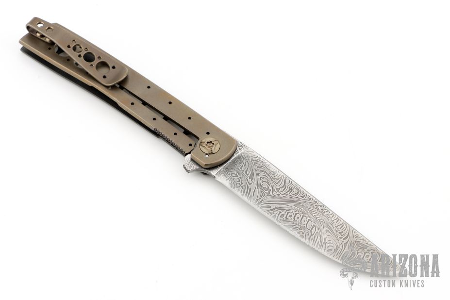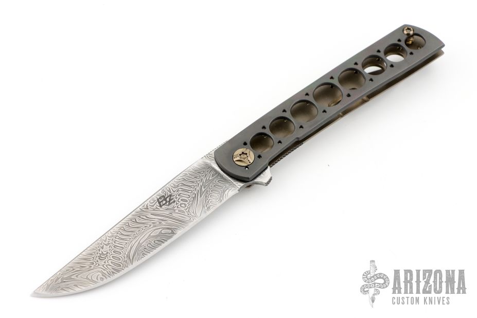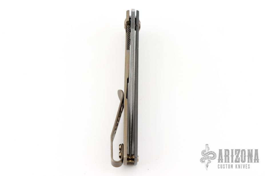 This Framelock flipper from Brad Zinker features a Grabak Damasteel blade with checkered thumbrest and flipper. The handle has a zirconium and anodized titanium frame with anodized and stonewashed titanium tip up clip, anodized titanium hardware. Nice detent, lockup and blade seating, rides on bearings. Includes a padded zippered case. New from maker at the 2025 Blade Show.