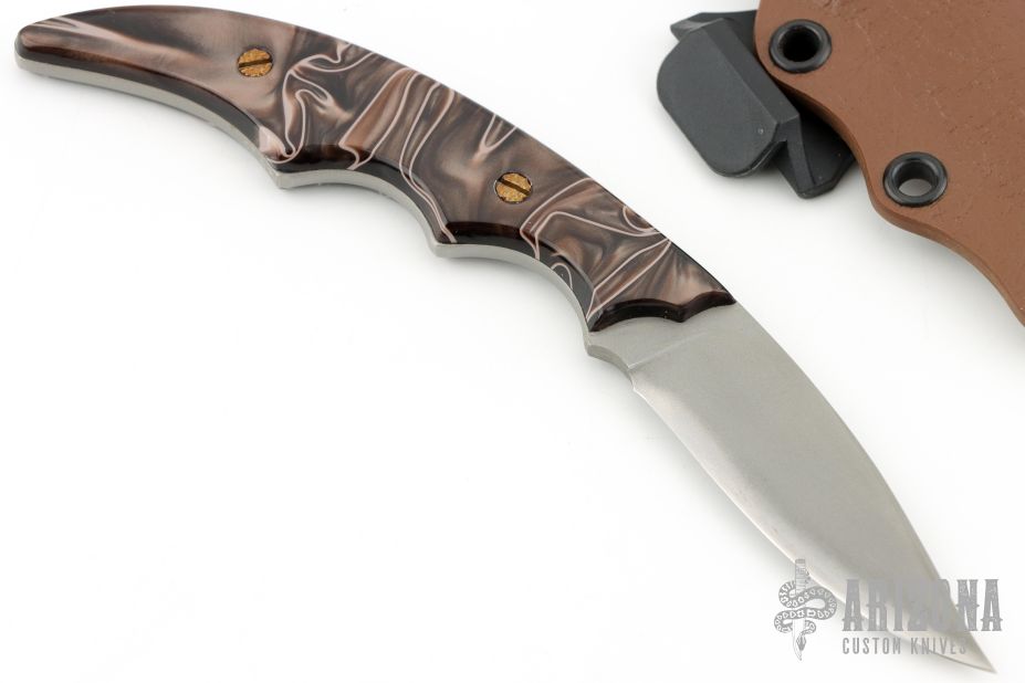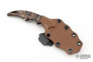 This Batwing by Master Smith Shane Taylor features a bead blasted blade with a buffed edge, .127" blade stock and .874" blade depth, full tang construction. The handle has kirinite scales with textured and anodized titanium screws. Comes with a kydex sheath and a zippered case. New from maker at the 2025 Blade Show.