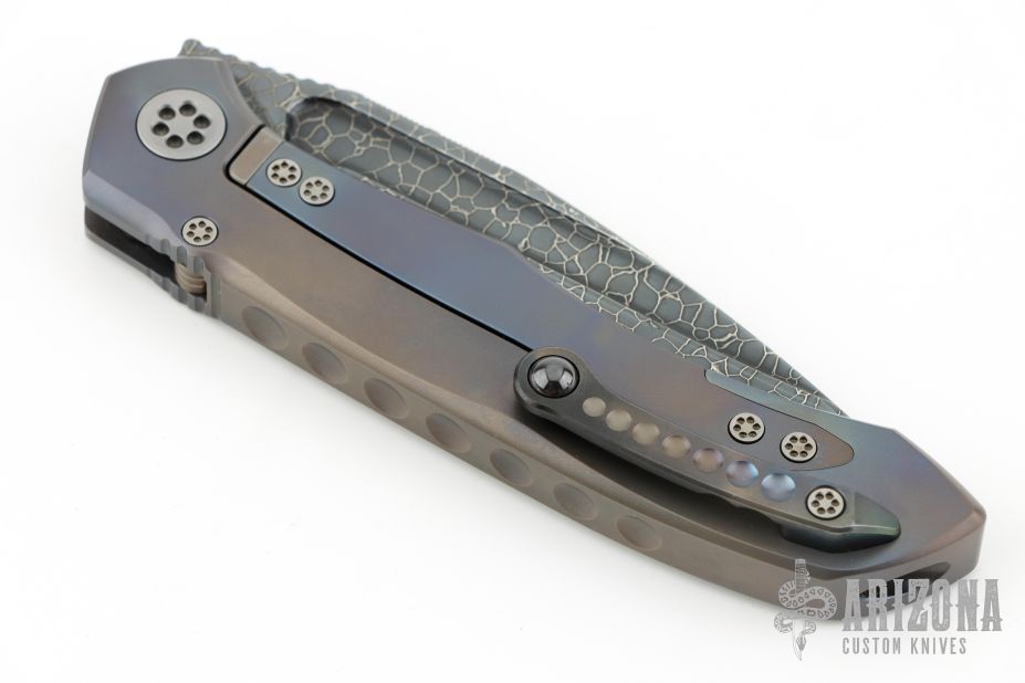 This Anax by Marfione Custom Knives features a Ball Bearing Damascus blade with notched thumbrest. The handle has an integral anodized and tumbled titanium frame with optional lanyard attachment. Tip up titanium clip with silicon nitride ball bearing. Nice detent, lockup and blade seating. Dated 09/2014 in the backstrap. Has some light scuffs otherwise Excellent condition. Doesn't come with anything but the knife.