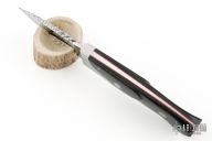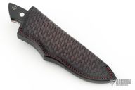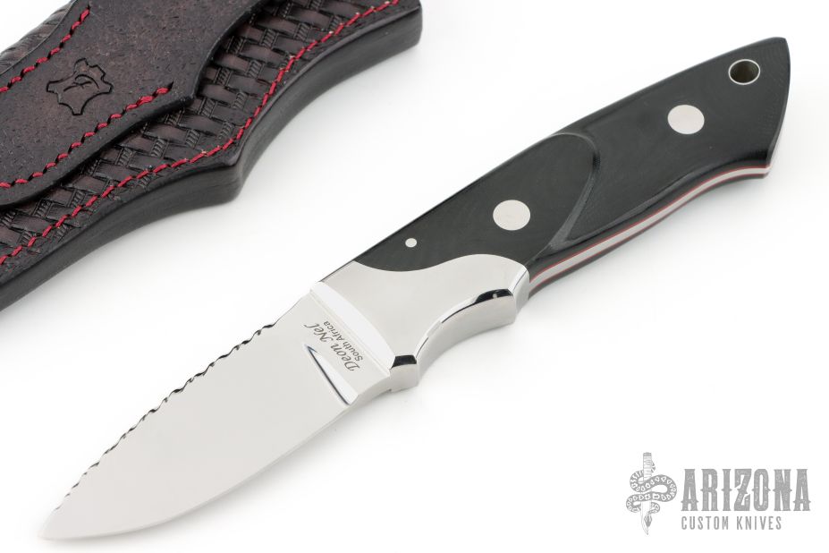 This Hunter by Deon Nel features a a mirror polished blade with fileworked spine, .197" blade stock and 1.071" blade depth, full tapered tang construction. The handle has a mirror polished 303 stainless steel bolsters, black linen micarta scales with red liners. Comes with a hand tooled brown leather sheath and zippered case. Excellent condition.
