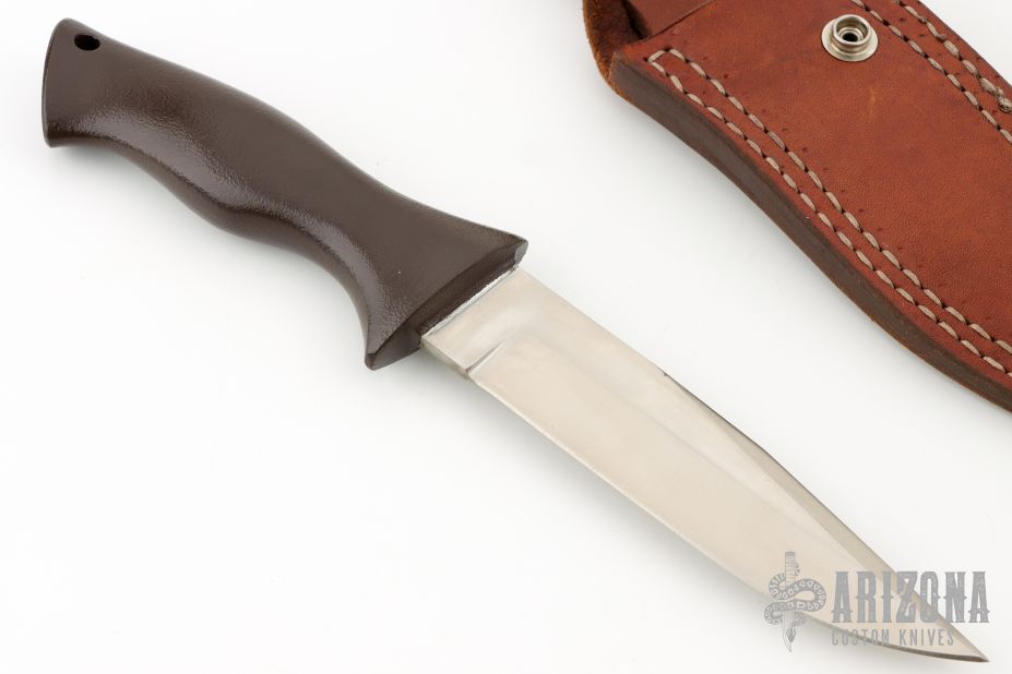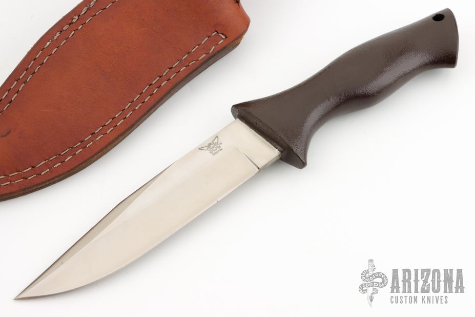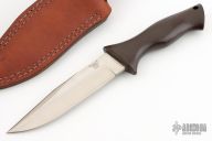 This Duramag by John Nelson Cooper features a satin finished blade with false top edge, .202" blade stock and 1.225" blade depth, hidden tang construction. The handle is cast aluminum with lanyard hole. Has some minor wear on the handle finish, otherwise excellent condition. Comes with a brown leather sheath.