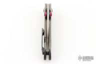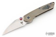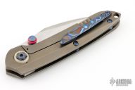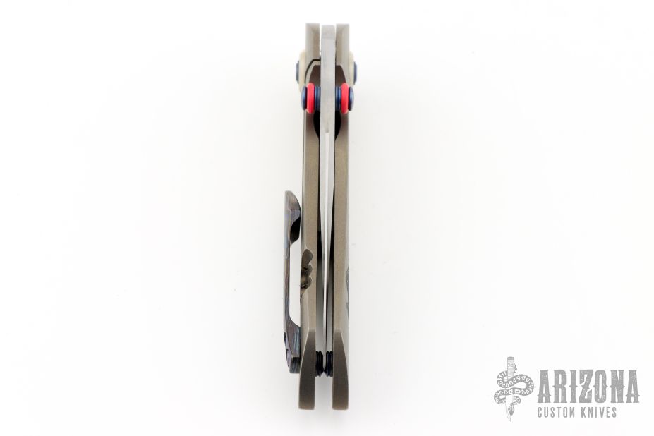 This Rougarou No.2 by Sparrow Knife Co features a satin finished blade with dual anodized titanium thumbstuds with red o-rings. The handle has a blasted and anodized titanium frame with laser engraved clipper ship,anodized titanium hardware, natural G-10 pivot collars, tip up black timascus clip. Nice detent, lockup and blade seating. Excellent condition.