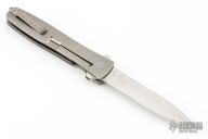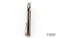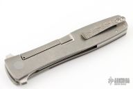 This Model 31 Flipper by Jason Clark features a hand rub satin finished double-edged blade with a notched flipper. The handle has a Damasteel bolster, red spacer, a single red/black fat carbon scale and a stonewashed titanium lockside. Damasteel tip up pocket clip. Floating stainless backspacer. Incudes a leather slip sheath and COA. New from maker at the 2025 Blade Show.