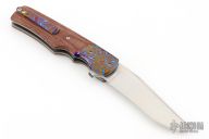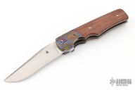 This Model 3 Flipper by Jason Clark features a hand rub satin finished blade with a notched flipper. The handle has a Timascus dovetailed bolsters, canvas micarta scales, bead blasted titanium liners, floating stainless steel backspacer, tip up timascus clip. Rides on bearings, nice detent, lockup and blade seating. Comes with a leather slip sheath and COA. New from maker at the 2025 Blade Show.