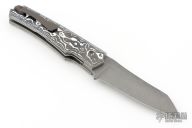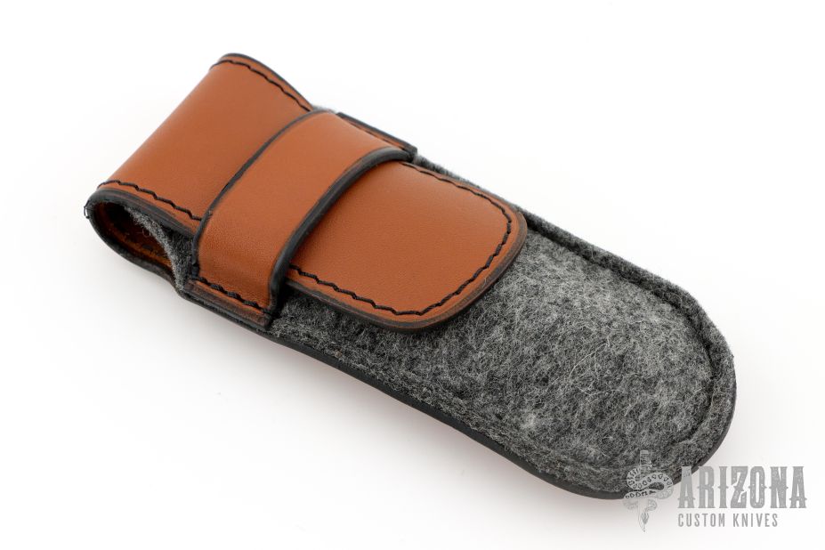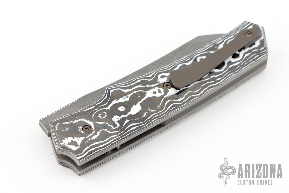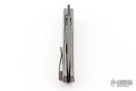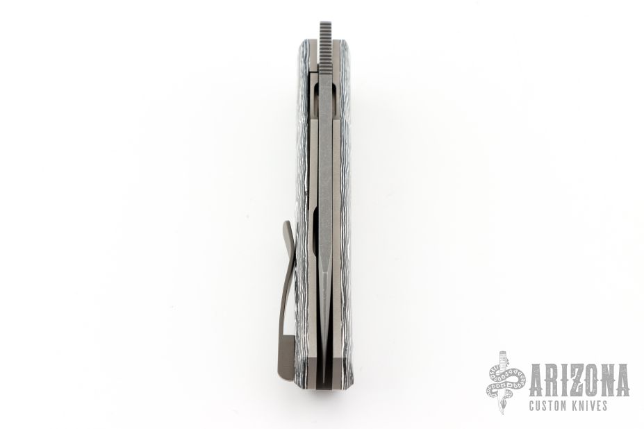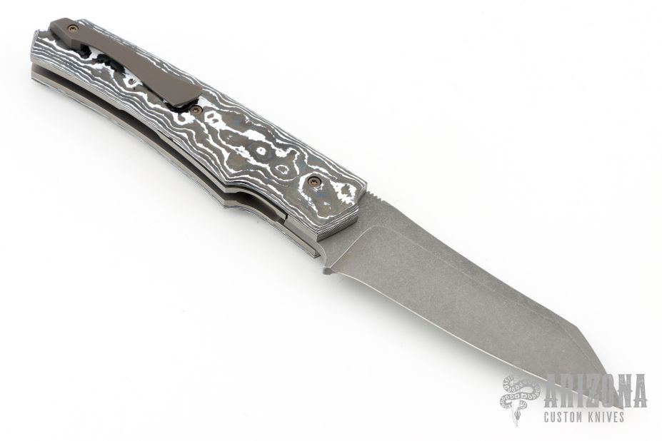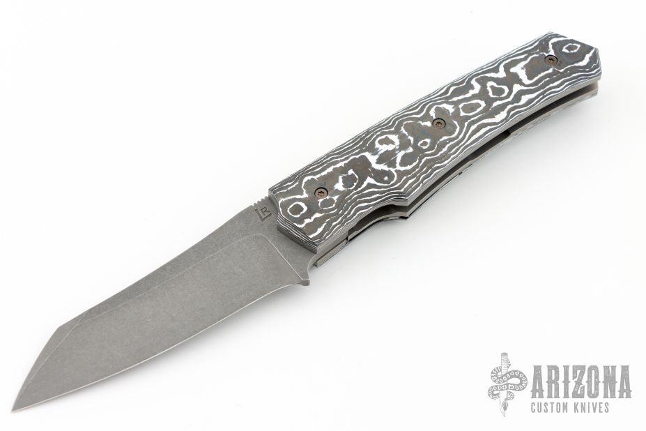 This Front Flipper by Remi Lavialle features a stonewashed blade with swedge and notched thumbrest, front flipper style opening. The handle has white storm carbon fiber scales, bead blasted titanium liners, blackened titanium backspacer, tip up titanium clip. Nice detent, lockup and blade seating. Comes with a leather slip sheath. New from maker at the 2025 Blade Show.
