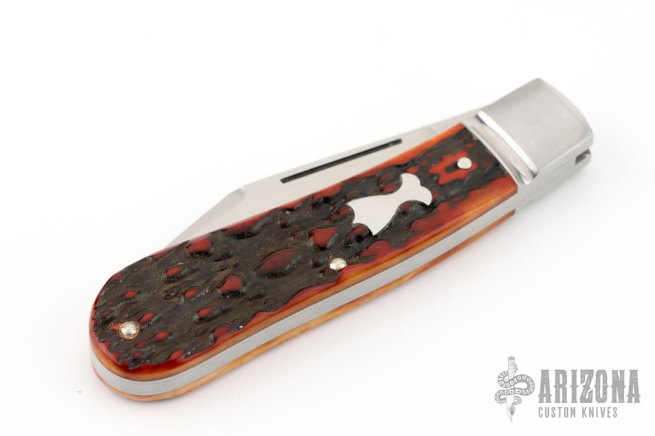 This Dixie Dogleg by Mike Zscherny features a spear point blade with a hand rubbed satin finish and nail nick. The handle has a fluted stainless steel bolsters, stag jigged bone covers, stainless steel liners and springs. Half stop on blade, flush in all positions. New from maker at the 2025 Blade Show. Comes with a zippered case.