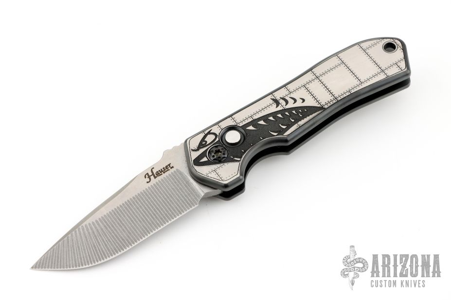 This Auto by Hauser Knives and Brian Fellhoelter features a stonewashed blade with milled bevels, and notched thumbrest. The handle has a two tone finished titanium frame with black cerakote accents and satin finished flats, and a tip up black zirconium clip. Comes in maker's zipper case. New from Maker at the 2025 Blade show!
