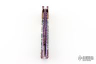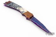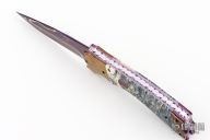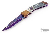 This Tempest side-opening automatic by Rainy Vallotton features a blued Baker Forge "Riptide" San Mai Damascus blade with false top edge. The handle has bronze colored Baker Forge "Riptide" Damascus double bolsters, and mammoth tooth scales with white liners, matching Damascus push button. File work on stainless steel backspacer and all around the anodized titanium liners. Strong and fast leaf spring action. Nice blade seating and lockup. Beautiful materials. Comes with a hard case and COA. New from maker at the 2025 Blade Show.