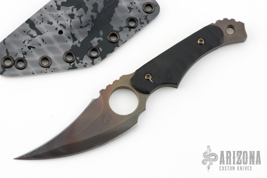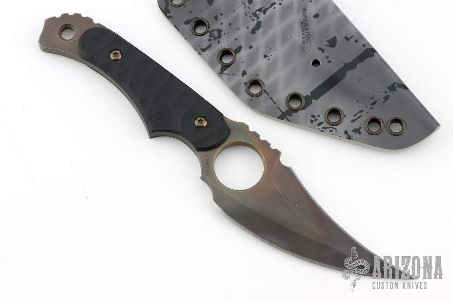 This Kyuss by Scorpion 6 Knives features a hawkbill double edge blade with notched thumbrest, .201" blade stock and 1.571" blade depth, full tang construction. The handle has textured black G-10 scales. Comes with a kydex sheath. Excellent condition.