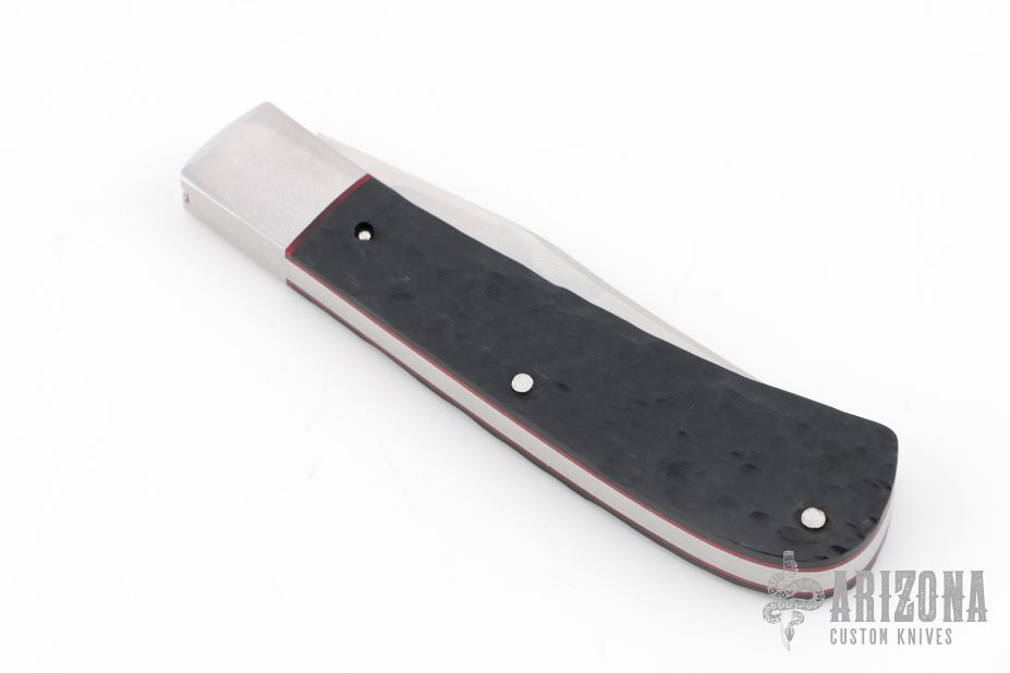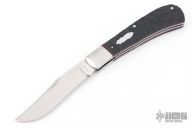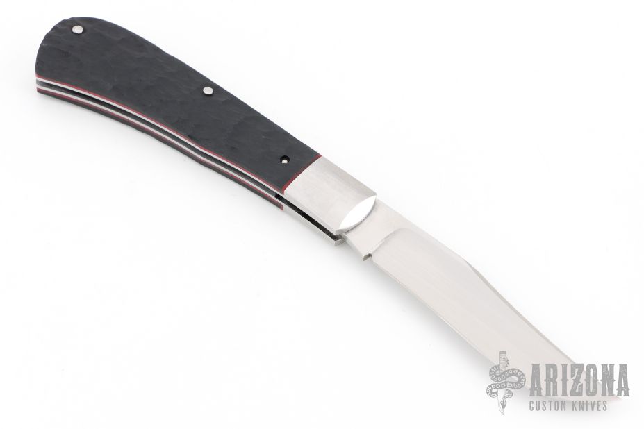 This Trapper by Bill Ruple features a hand rub satin finished blade with a single nail nick.  The handle has stainless steel bolsters, stainless steel liners and spring with jigged black paper micarta covers with red liners and a stainless steel escutcheon. Has half-stop, flush in all positions. Comes with a zippered case and COA. New from maker at the 2025 Blade Show.