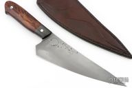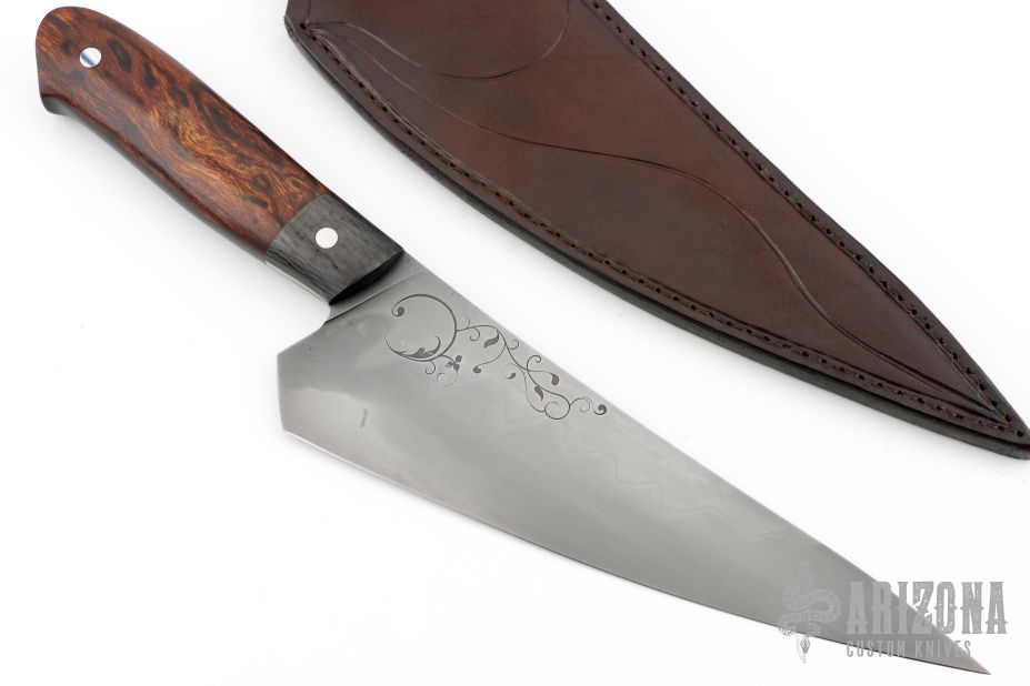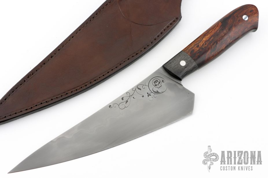 This Chef Knife by Mariano Yannoni features an uhb20c blade with nice hamon (4mm), .135" blade stock and 2.371" blade depth, hidden tang construction. The handle has a carbon fiber bolster, and Corby bolts ironwood grip. The handle has black G10 liners and backstrap. Comes with very nice leather sheath, COA, and maker's soft knife sleeve. New from maker at the 2025 Blade Show!