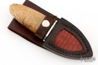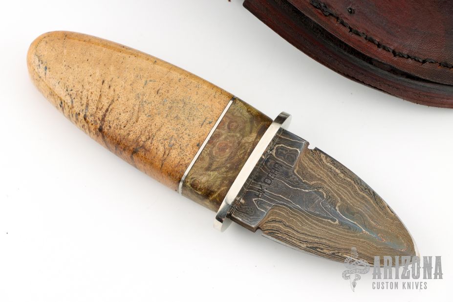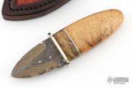 This Dagger by Herb Derr features a Random Pattern Damascus double edged blade with .145" blade depth and 1.340" blade depth, hidden tang construction. The handle has a nickel silver guard, Stellar Seacow rib bone grip with maple burl and nickel silver spacers. Includes a brown leather sheath with crocodile skin inlay. New from maker at the 2025 Blade Show. Comes with COA