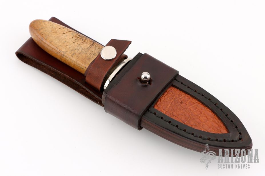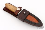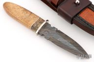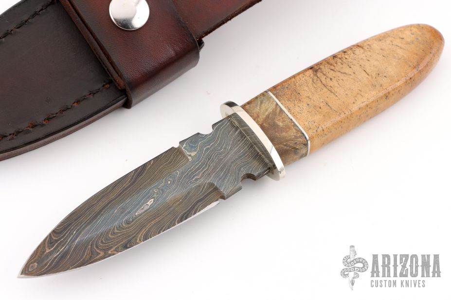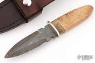 This Dagger by Herb Derr features a Twist Pattern Damascus double edged blade with .158" blade depth and 1.151" blade depth, hidden tang construction. The handle has a nickel silver guard, Stellar Seacow rib bone grip with maple burl and nickel silver spacers. Includes a brown leather sheath with crocodile skin inlay. New from maker at the 2025 Blade Show. Comes with COA