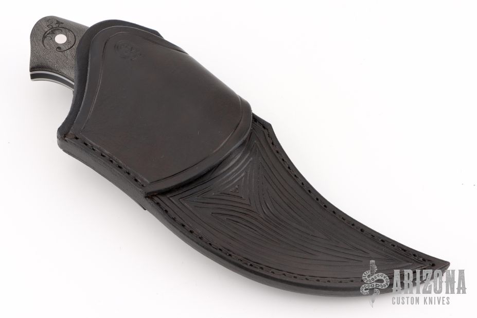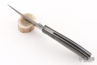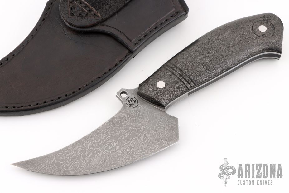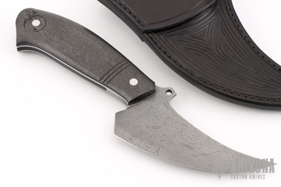 This Hunter by Mariano Yannoni features an upswept CAS Damascus (Claudio A. Sobral) blade with nice hamon, notched thumbramp, false top edge, .156" blade stock and 2.29" blade depth, hidden tang construction. The handle has fluted, engraved, and pinned carbon fiber coral scales. Comes with a brown leather sheath, COA and maker's soft case. New from maker at the 2025 Blade Show.