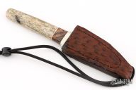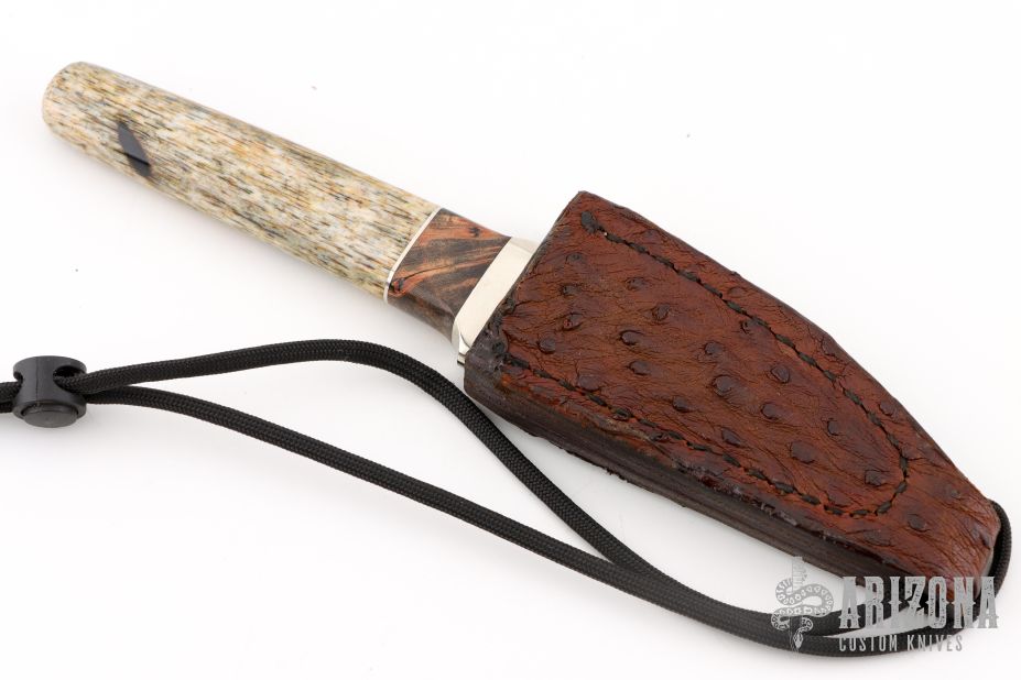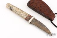 This Neck Knife by Herb Derr features a Birds Eye Damascus blade with .147" blade stock and .861" blade depth, hidden tang construction. The handle is comprised of a nickel silver guard with maple burl and nickel silver spacers and a giraffe leg bone grip. Includes a brown leather sheath with ostrich leg skin overlay and magnet inside the sheath to hold the knife securely in place. Comes with COA. New from maker at the 2025 Blade show.