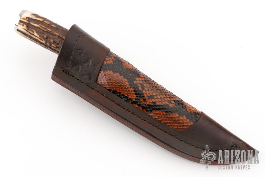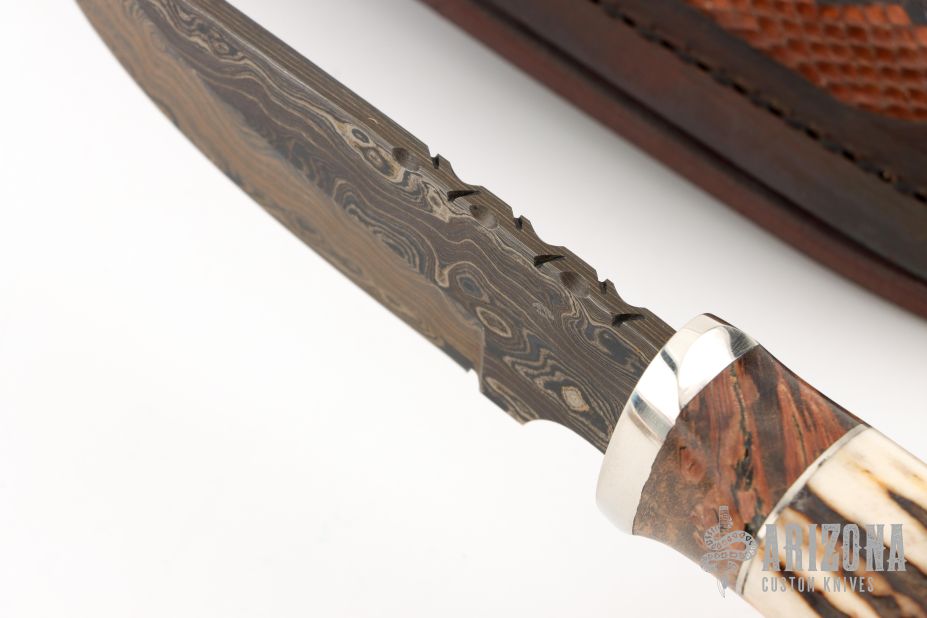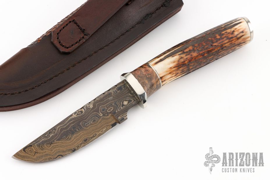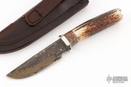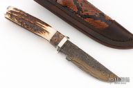This Hunter by Herb Derr features a Birds Eye Damascus blade with file worked spine, .162" blade stock and 1.119" blade depth, hidden tang construction. The handle is comprised of a nickel silver guard and pommel with maple burl and nickel silver spacer and a stag grip. Includes a brown leather sheath with Boa skin inlay. Comes with COA. New from maker at the 2025 Blade show.