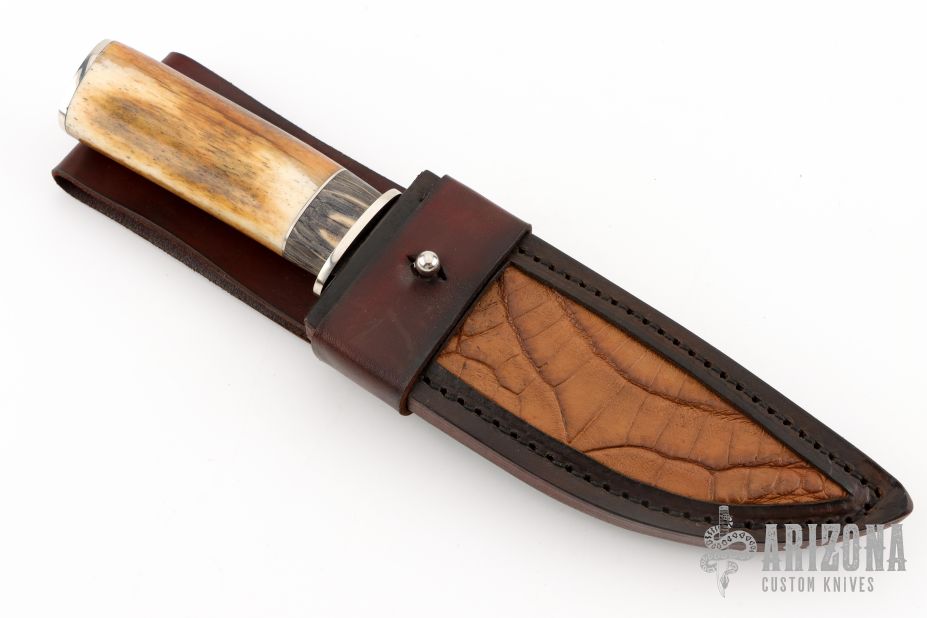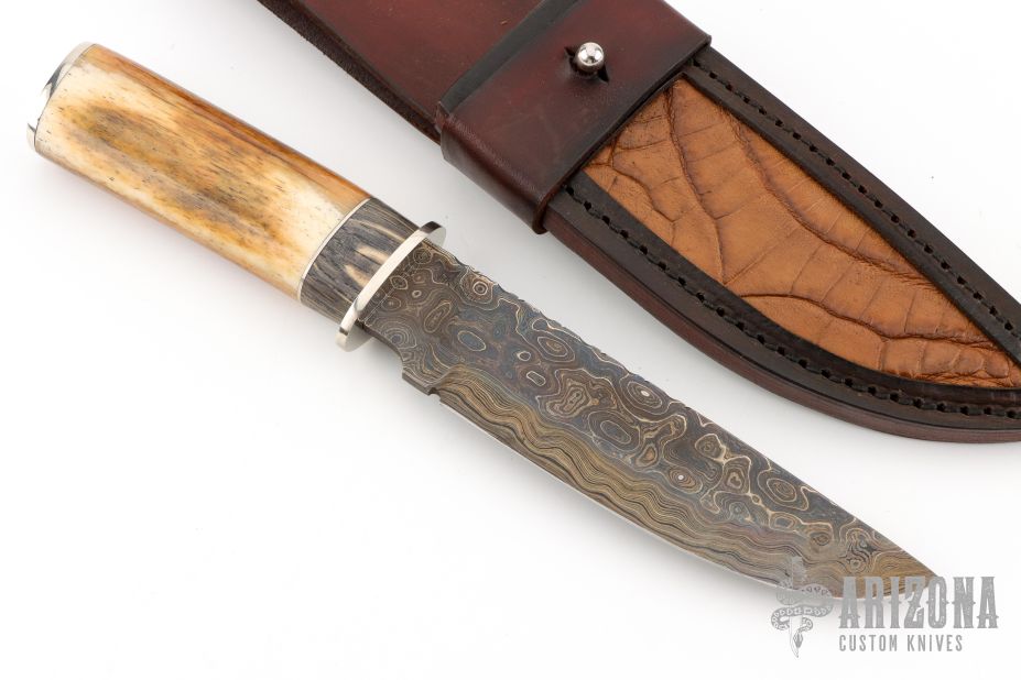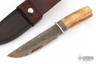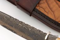 This Hunter by Herb Derr features a Birds Eye Damascus blade with file worked spine, .157" blade stock and 1.398" blade depth, hidden tang construction. The handle is comprised of a nickel silver guard and pommel with bog oak and nickel silver spacer and an mammoth bone grip. Includes a brown leather sheath with croc skin inlay. Comes with COA. New from maker at the 2025 Blade show.