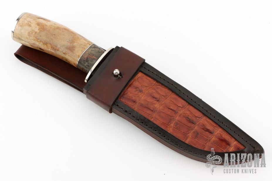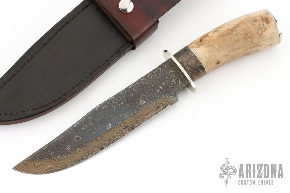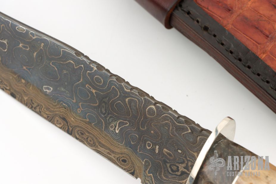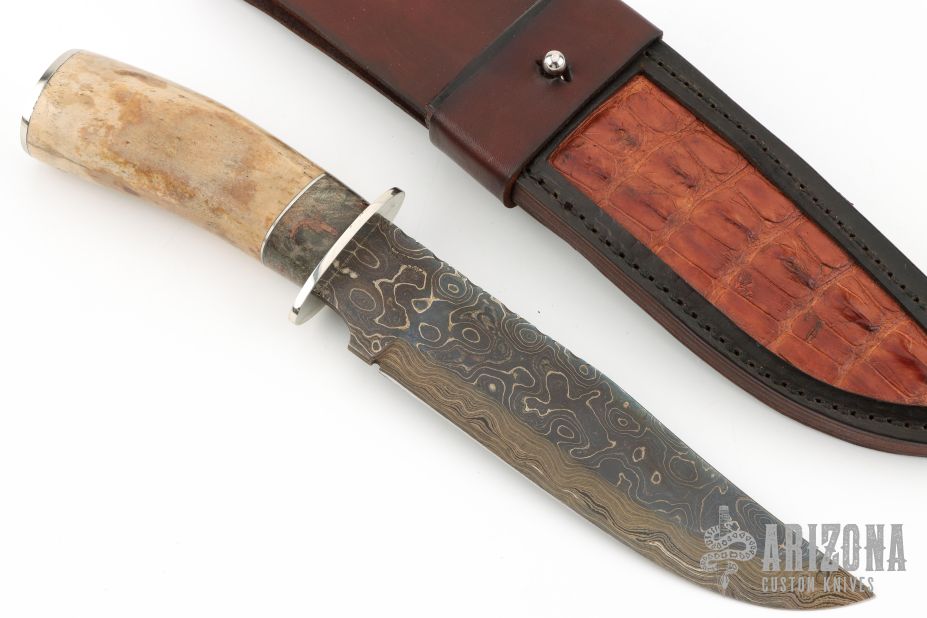 This Bowie by Herb Derr features a Birds Eye Damascus blade with file worked spine, .164" blade stock and 1.575" blade depth, hidden tang construction. The handle is comprised of a nickel silver guard and pommel with maple burl and nickel silver spacer and an oosic grip. Includes a brown leather sheath with croc skin inlay. Comes with COA. New from maker at the 2025 Blade show.
