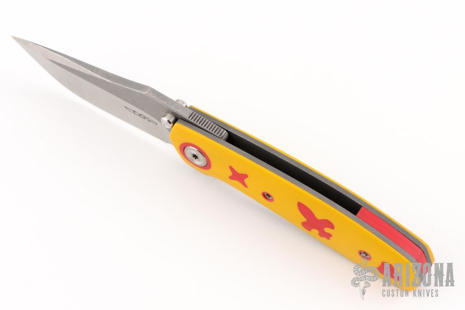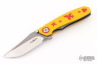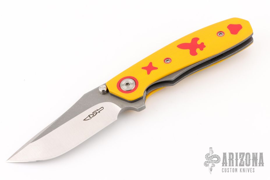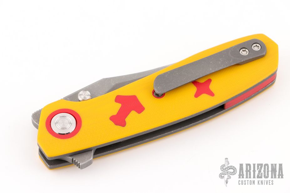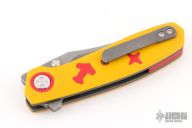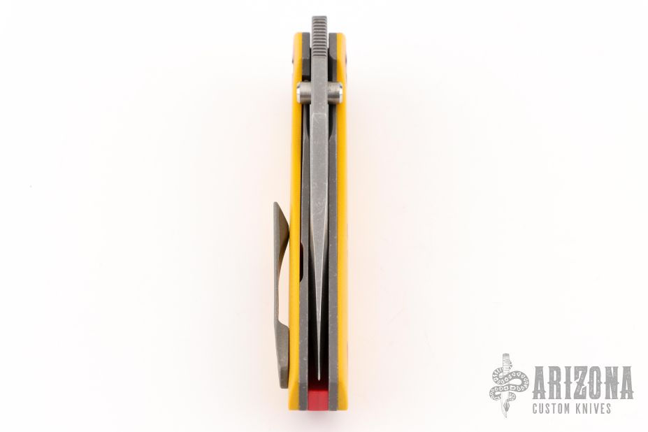 This Aston by Dario Zadravec (Daracsteel) features a two-tone blade with thumb ramp, and dual thumbstuds. The handle is constructed of acid/tumble finished titanium, yellow G10 covers, with red G10 inlays and pronounced lockbar. Red backstrap and matching titanium pocket clip is positioned for tip up carry. Rides on washers. Comes with COA dated Blade Show ATL '25. New from maker!