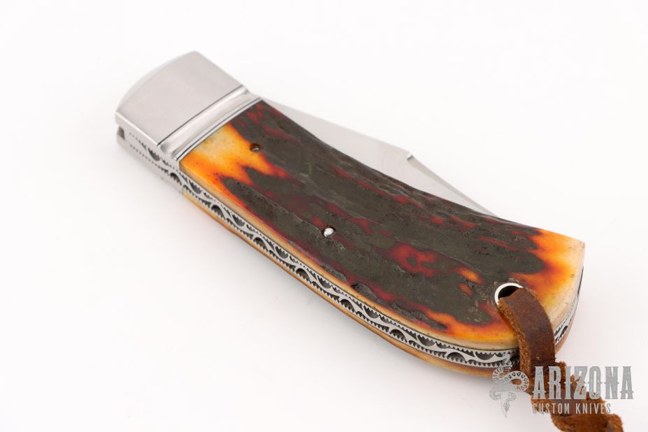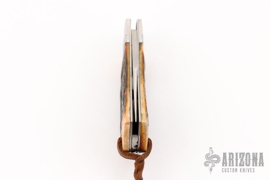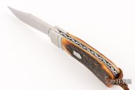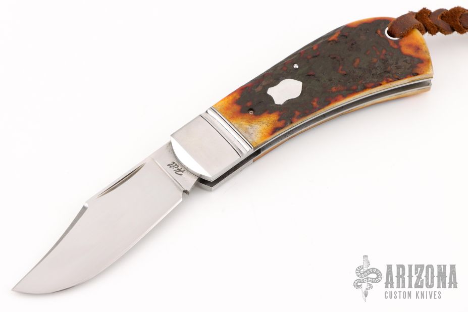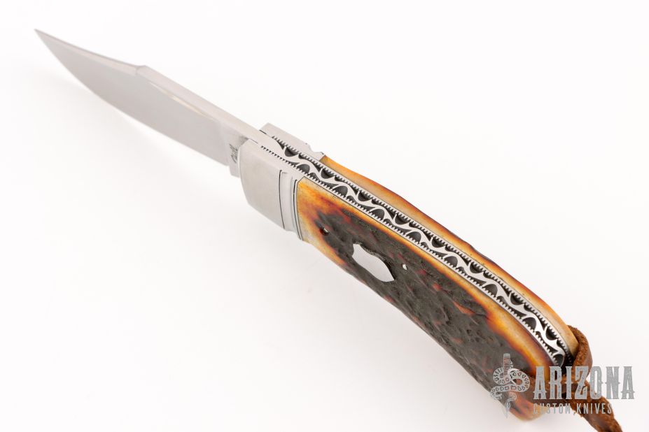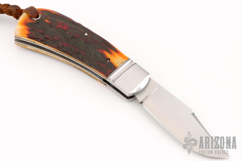 This Chubby Lanny's Clip Slipjoint by Tobin Hill features a hand rub satin finished clip point blade with a nail nick.  The handle has fluted and threaded stainless steel bolsters, stag covers, fileworked stainless steel liners and spring. Has half-stop, flush in all positions. Includes a padded zippered case.  Brand New from maker at the 2025 Blade Show.