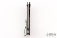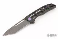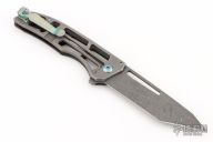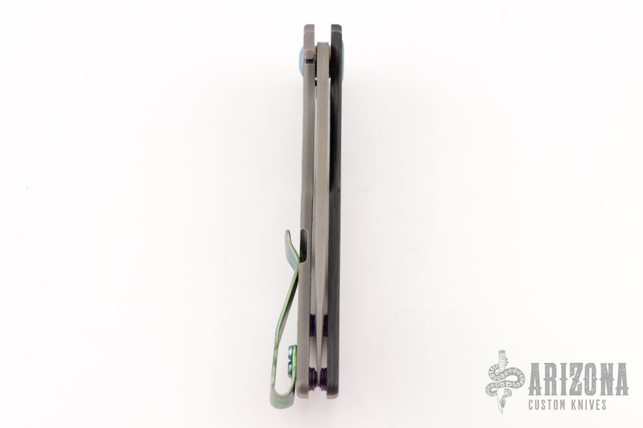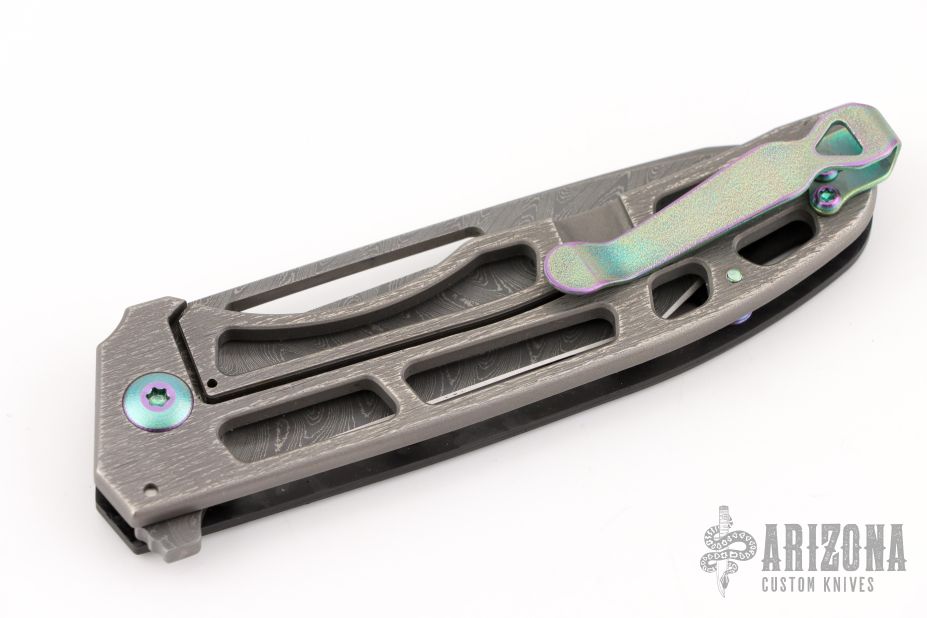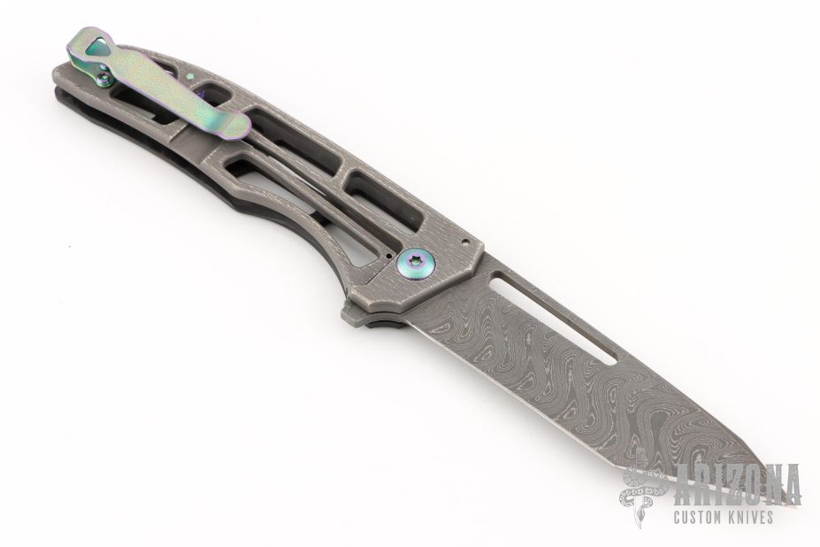 This Slitter from John Gray Knives features a Damascus clip point blade with a flipper. The handle has a ported carbon fiber and bark finished titanium frame with orange peel/anodized pivot and tip up clip. Nice detent, lockup and blade seating. Comes with maker's pouch and patch. New from maker at the 2025 Blade Show!