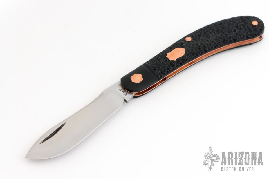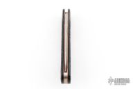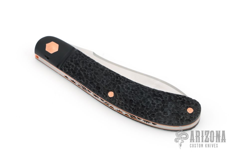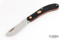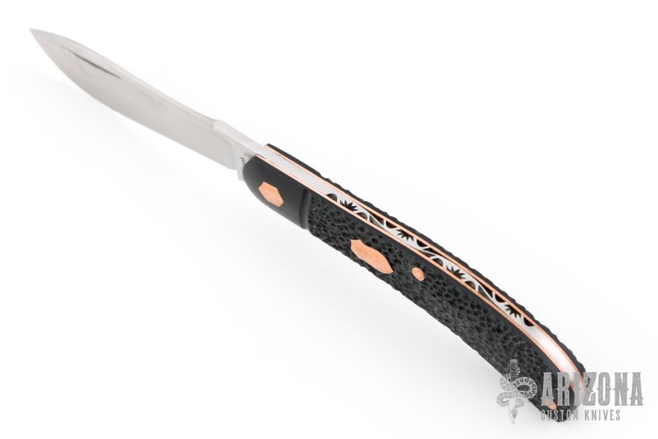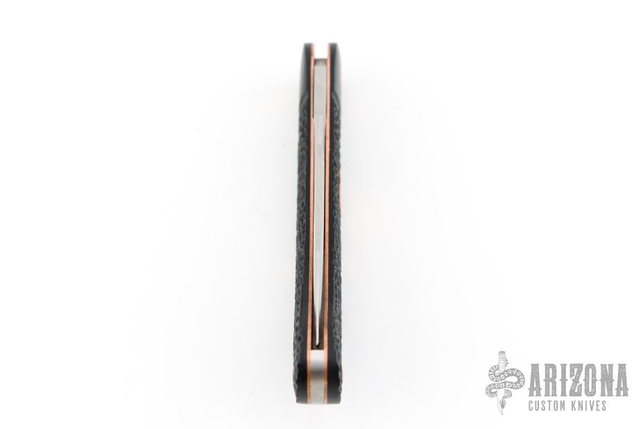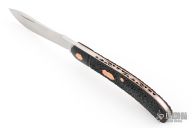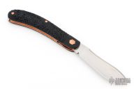 This Shadow Pattern Rabbit Skinner by Couch Knives features a satin finished blade with nail nick. The handle has jigged and fluted black paper micarta covers with a copper pivot, pins and escutcheon, copper liners, fileworked CPM154 spring. Has half-stop, flush in all positions. Comes with a zippered case and COA. New from maker at the 2025 Blade Show.
