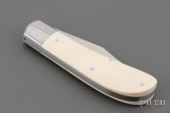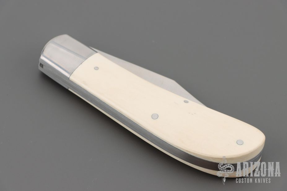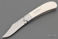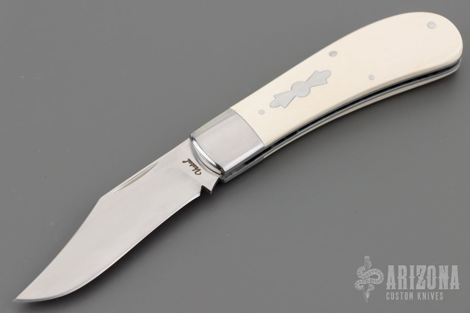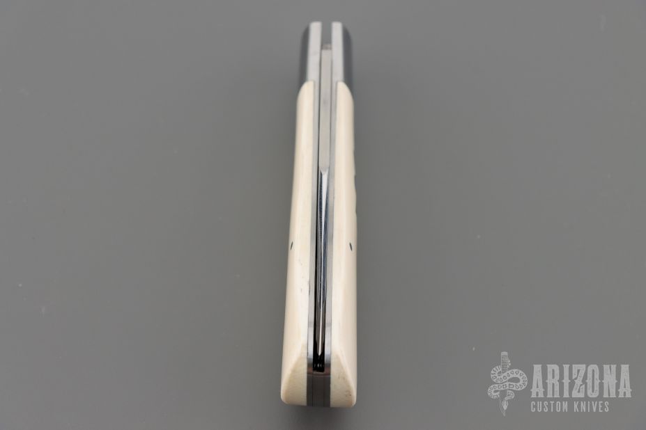 This Lanny's Clip by Charles Vestal features a hand rub satin finished blade with nail nick. The handle has stainless steel bolsters with integral liners, mammoth ivory covers with stainless steel escutcheon, CPM-154 spring. Has half-stop, flush in all positions. Comes with a zippered case and COA. New from maker at the 2025 Blade Show.